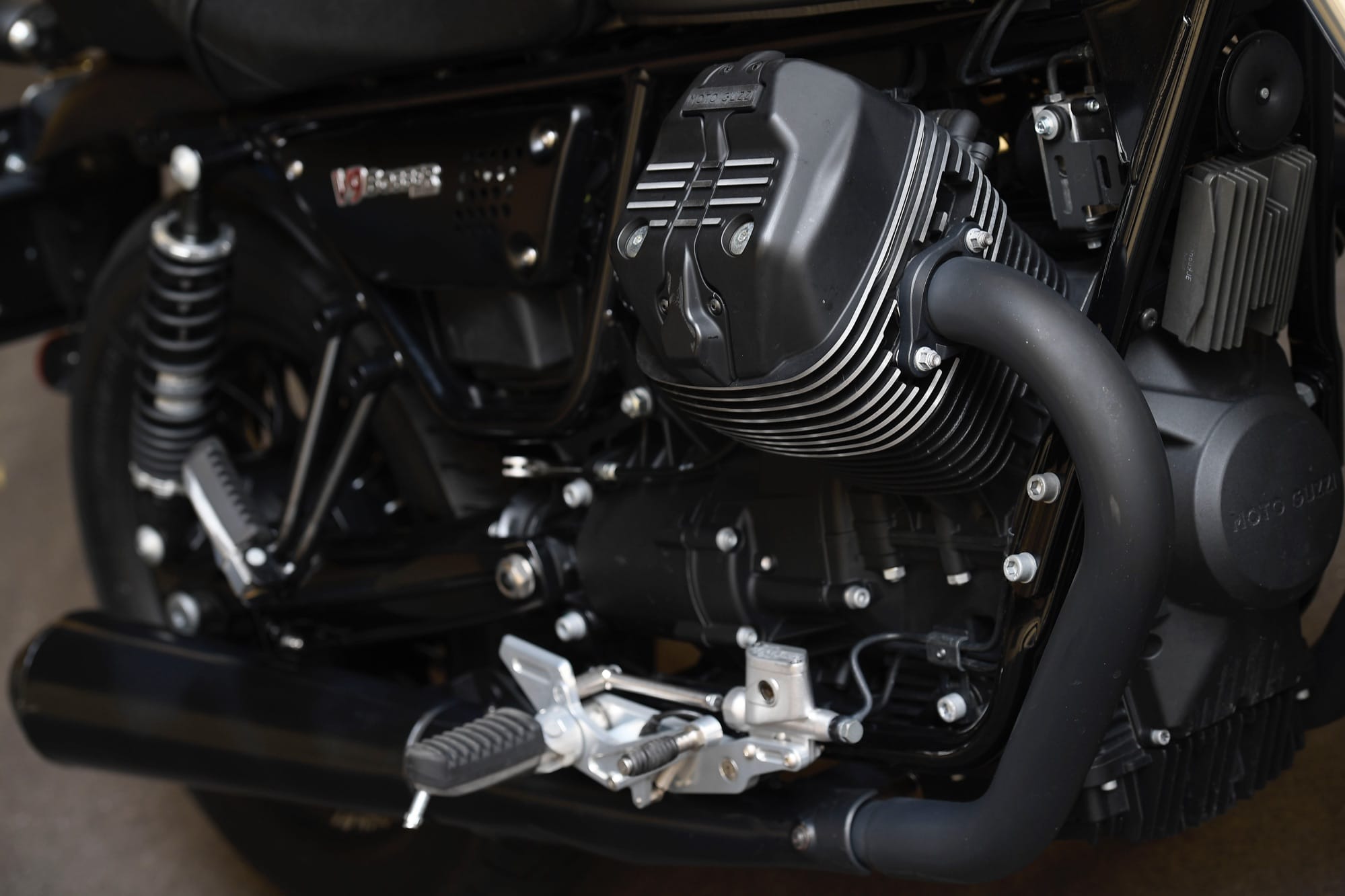 Nella parte alta del motore, teste, pistoni e cilindri in alluminio sono studiati per sfruttare al meglio le caratteristiche del propulsore. La cubatura è ottenuta grazie a valori di alesaggio e corsa rispettivamente di 84x77 mm. La distribuzione è comandata da un sistema ad aste e bilancieri e adotta 2 valvole per cilindro disposte in maniera inclinata nella testa. L’alimentazione si affida a un sistema d’iniezione elettronica monocorpo Marelli, gestito dalla specifica centralina elettronica. Degna di nota è la presenza nelle teste dell’ingresso del sistema di aria ausiliaria, il quale, abbinato al catalizzatore trivalente, alla doppia sonda Lambda e alla totale progettazione del motore, permettono al twin 850 Moto Guzzi di rispettare la normativa antinquinamento Euro 4. L’unità è capace di esprimere 62 Nm di coppia a soli 3.000 giri/min, con una potenza massima di 55 CV a 6.250 giri/min, valori che dimostrano l’impegno di Moto Guzzi nel raggiungere elevati livelli di coppia già ai bassi regimi di rotazione. Questo propulsore vanta carattere e prontezza sorprendenti, che contribuiscono a un’esperienza di guida davvero eccitante. È disponibile la versione depotenziata, in linea con le limitazioni della patente A2 e ideale per i nuovi guzzisti, che possono contare anche sul peso complessivo ridotto a livelli record e sulla generale facilità di guida di entrambe le V9.