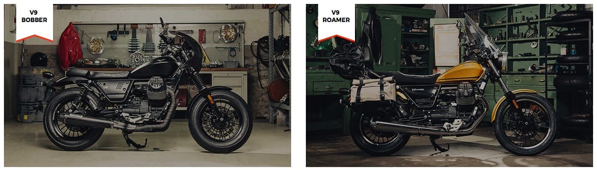 La stessa cultura motociclistica anima le due motociclette di Moto Guzzi. V9 Roamer è la custom universale facile e intuitiva, magnifica da esibire e appagante da guidare, ricca di dettagli unici e finiture da fuoriclasse. L’animo più scuro e notturno si chiama invece V9 Bobber, caratterizzata dai grossi pneumatici e dal look total black.