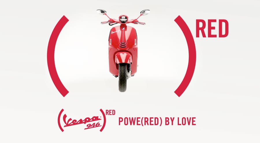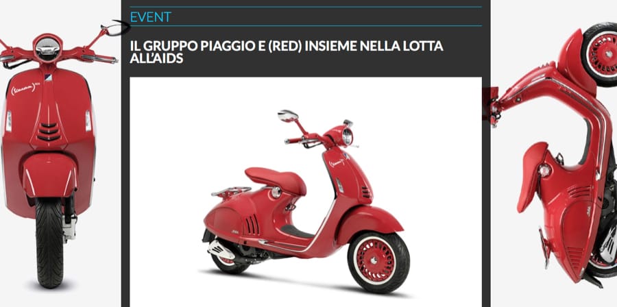 La collaborazione tra Gruppo Piaggio e (RED), ha generato (VESPA 946) RED che si veste interamente di rosso per contribuire ai programmi di lotta all’AIDS, alla tubercolosi e alla malaria. (VESPA 946) RED rappresenta il modo più elegante e ricco di stile per dimostrare sensibilità a un grande problema e rappresenta l’opportunità di aderire concretamente a una battaglia di civiltà tra le più difficili.