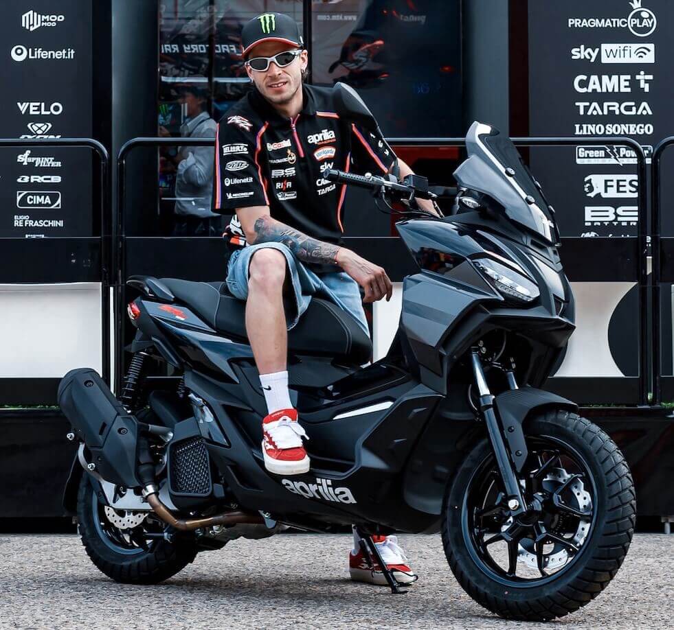 Il pilota di Aprilia Racing in MotoGp, Marco Bezzecchi, con lo scooter Aprilia SR GT MY 2025.