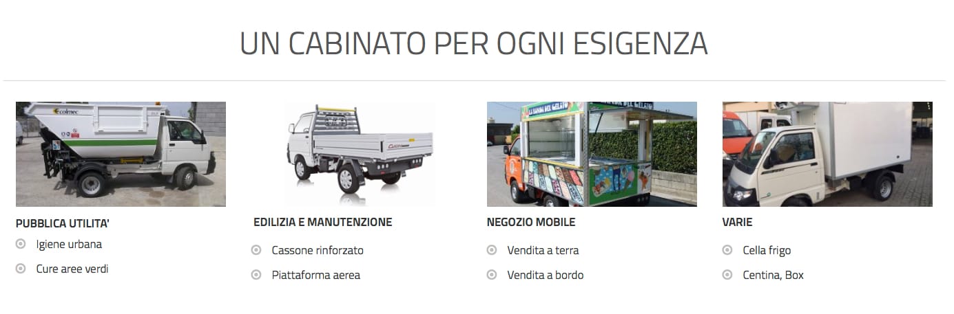 Il modello Chassis, nei suoi molteplici allestimenti, riesce infatti a soddisfare i bisogni più svariati: dalla pubblica utilità all’edilizia e manutenzione, dal negozio mobile al servizio di trasporto speciale, operando in totale sicurezza anche nei centri urbani più angusti e congestionati.