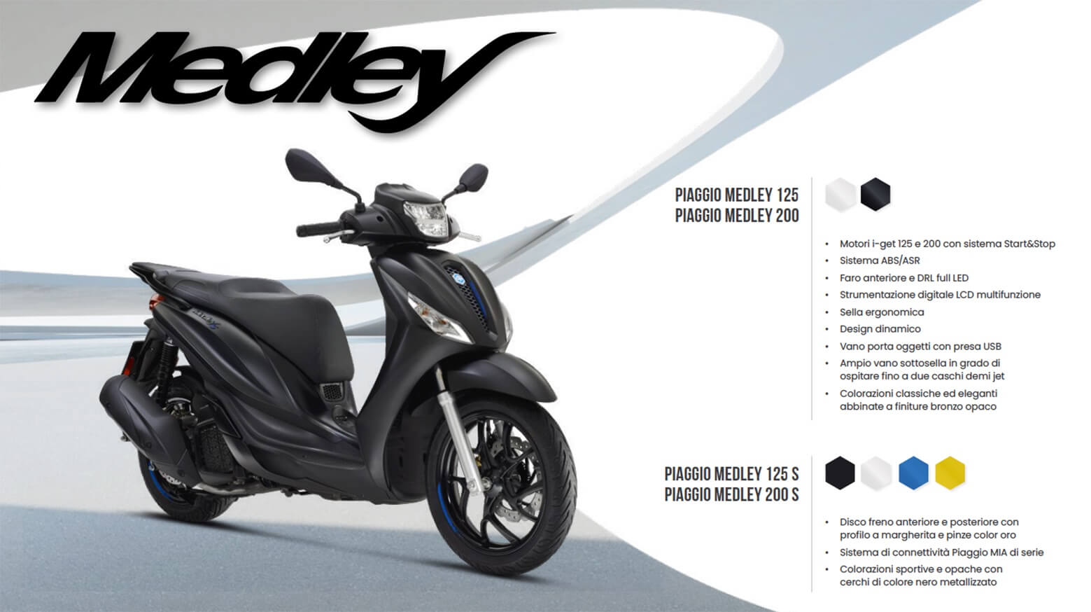 Il nuovo Piaggio Medley è disponibile nelle versioni Medley e Medley S. Medley S si distingue per le finiture nere, decisamente sportive; le varianti cromatiche sono Nero Meteora (opaco), Bianco Luna, Blu Ardesia (opaco), e Oro Opaco.