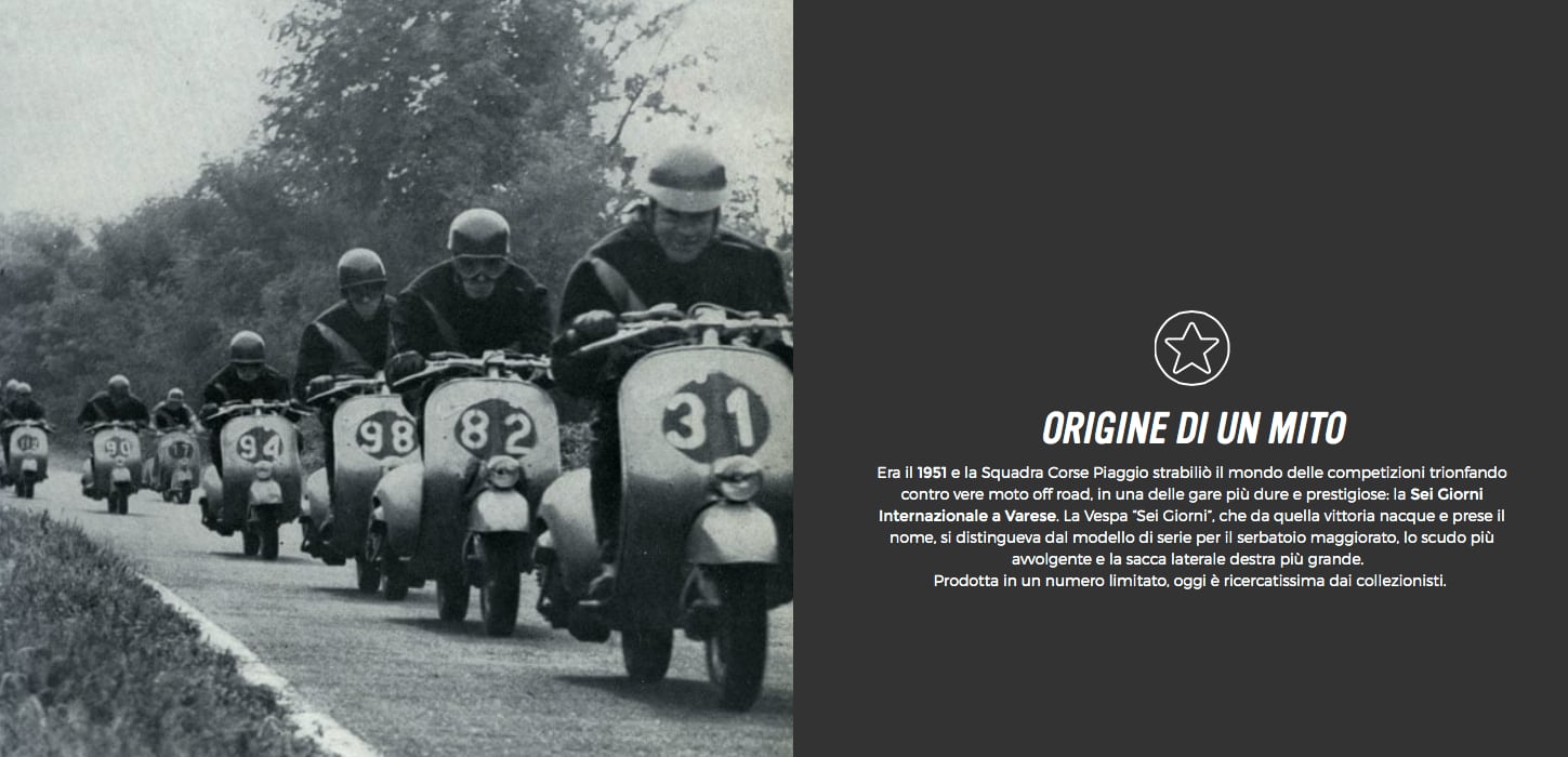 Anche la nuova edizione di Vespa Sei Giorni rievoca l’epopea vittoriosa dell’originale e omonima Vespa Sport “Sei Giorni”, realizzata per la massacrante gara di regolarità “Sei Giorni Internazionale di Varese” del 1951, nella quale fu protagonista assoluta e sorprendente, conquistando 9 medaglie d’oro.