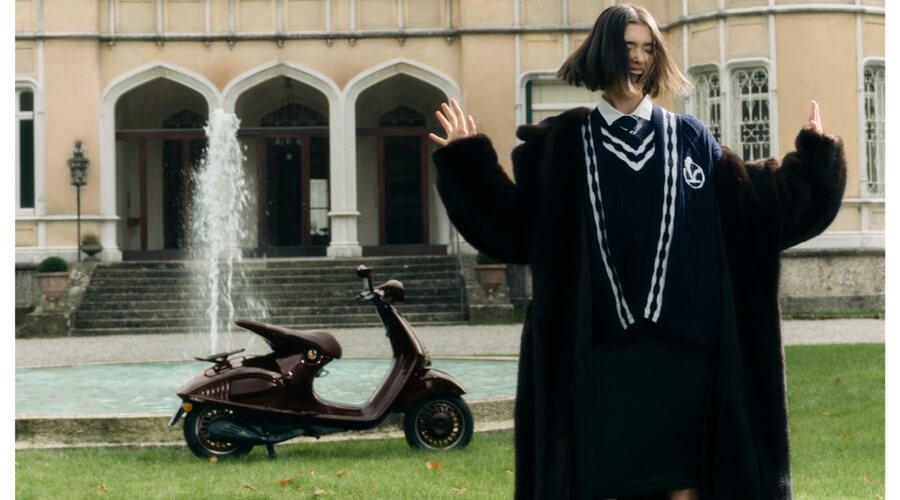 Insieme a Vespa 946 Horse prende vita IN SELLA, terzo drop della collezione AL VENTO, pensata per chi vive lo stile come espressione autentica della propria personalità. Questa capsule apre un nuovo capitolo del progetto, presentando il nuovo stemma Royal, un design grafico composto da un cavallo e un bassotto speculari, ispirato alle grafiche dell’archivio Vespa rielaborato in chiave moderna. Lo troviamo applicato alla varsity jacket in lana, arricchita da ricami dorati e dettagli che richiamano la regalità della collezione e l’heritage del brand.