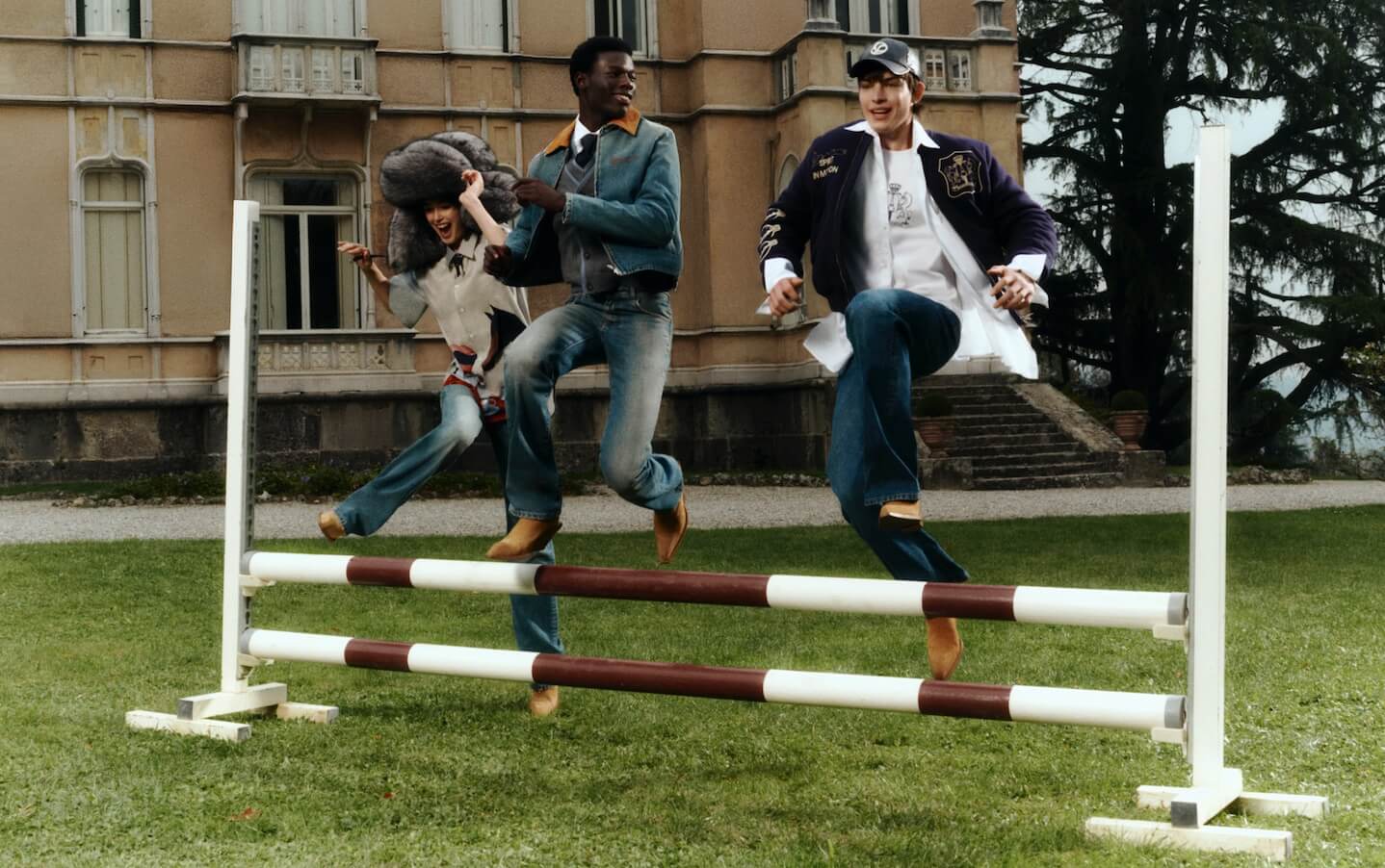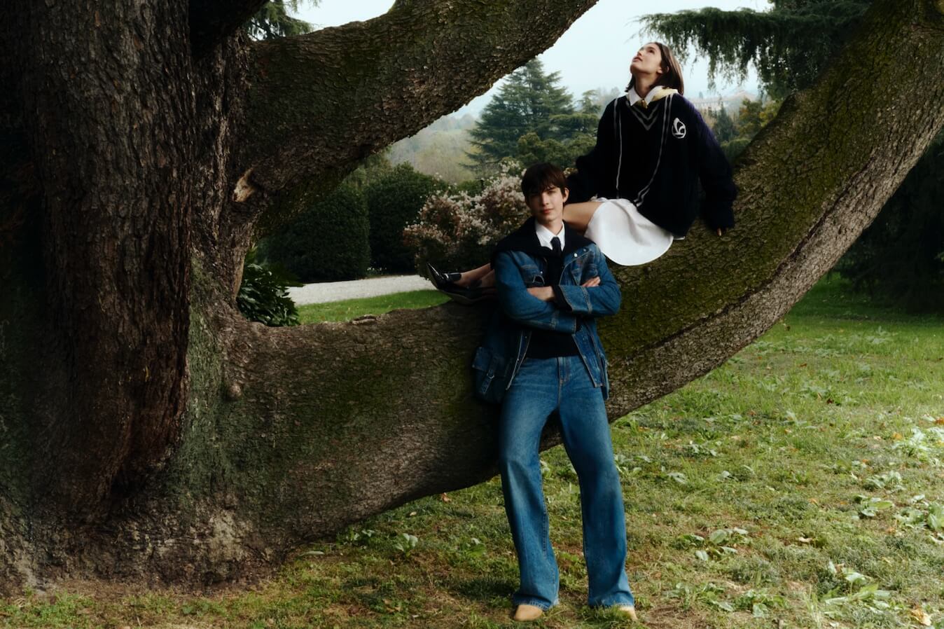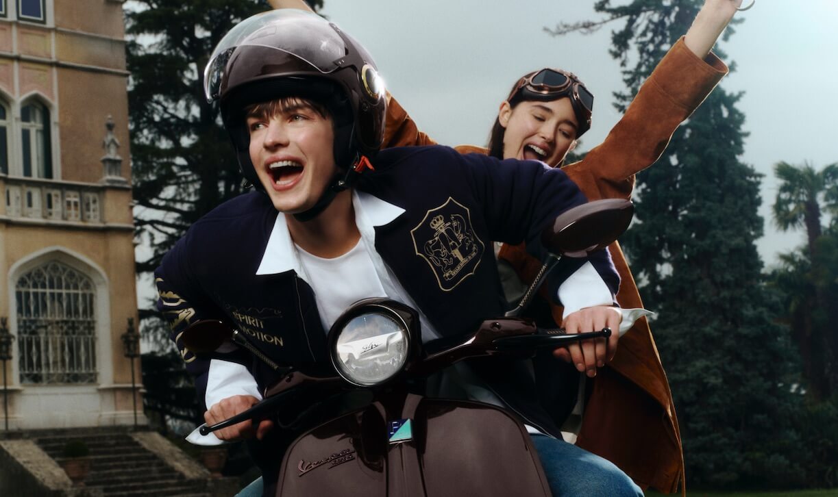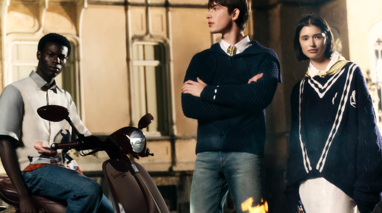 Il colore protagonista è il blu navy, scelto per la sua eleganza pulita e trasversale. La maglieria, tra cui maglioni, gilet e cardigan a trecce, contraddistinta dal monogramma V e da elementi ispirati alle cuciture artigianali della selleria. Linee fluide e rifiniture meticolose emergono su felpe e t-shirt che interpretano con leggerezza l’universo Vespa, mentre la camicia in popeline presenta una grafica ironica: un uomo con casco Vespa e un cavallo intenti a gustare un espresso.
