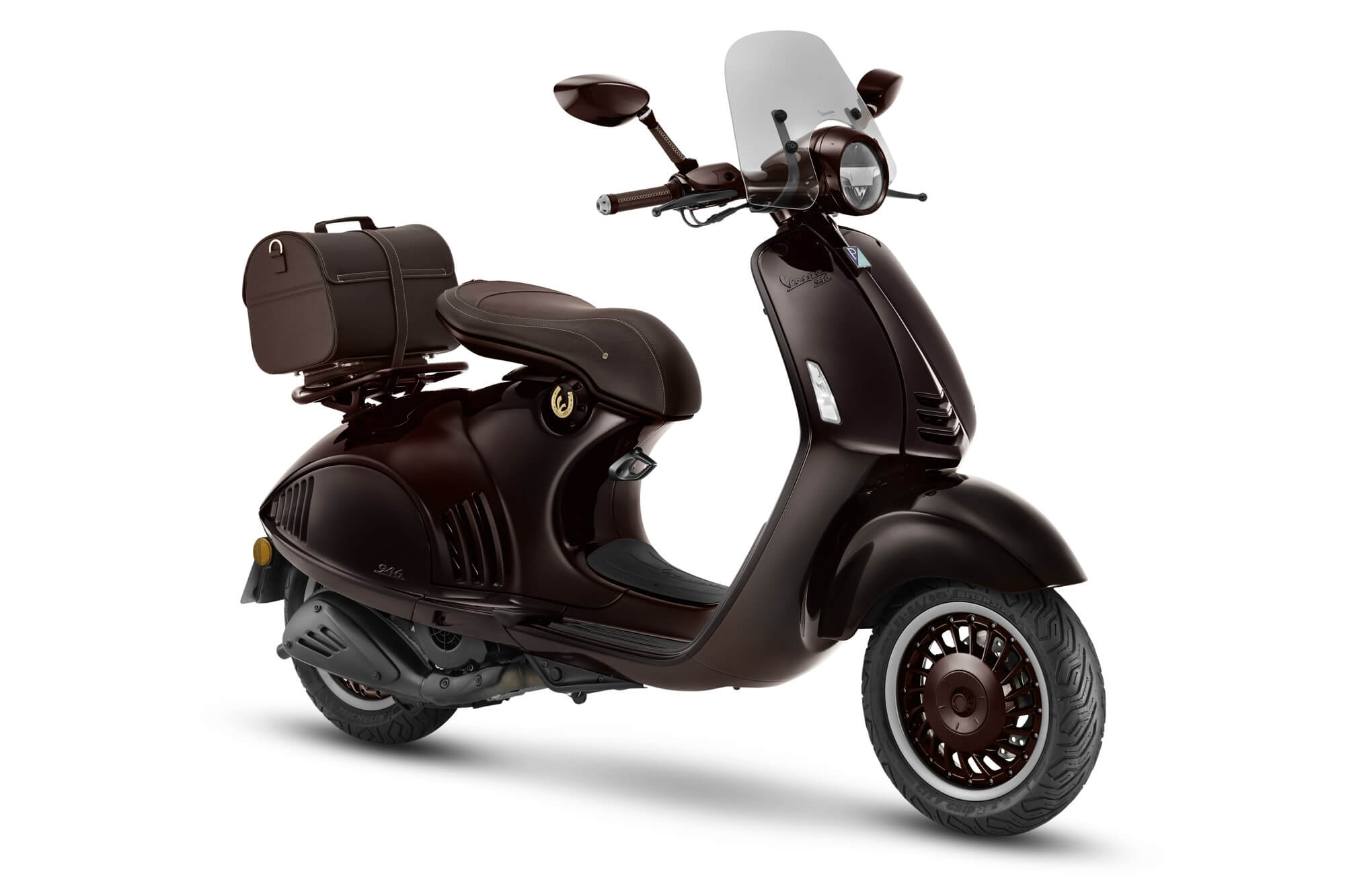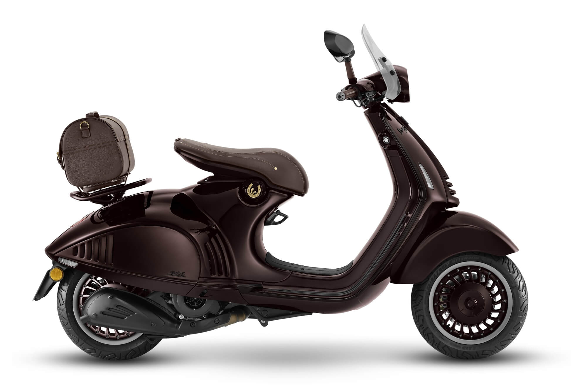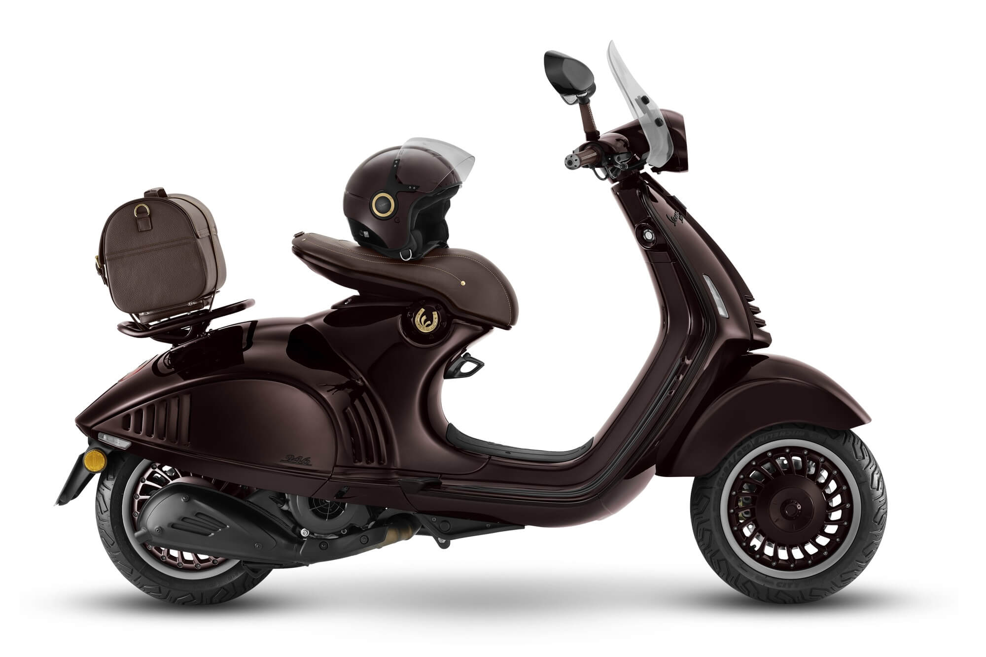 La selezione di accessori accompagna l’edizione limitata con cura e attenzione per riflettere lo stile equestre. Realizzata in Italia con la stessa pelle della sella, la borsa posteriore è pratica ed elegante, mentre il parabrezza presenta supporti in alluminio che ne arricchiscono l’estetica. In linea con Vespa 946 Horse, il casco jet sfoggia la V dorata tridimensionale sulla parte posteriore, confermando una forte identità distintiva.