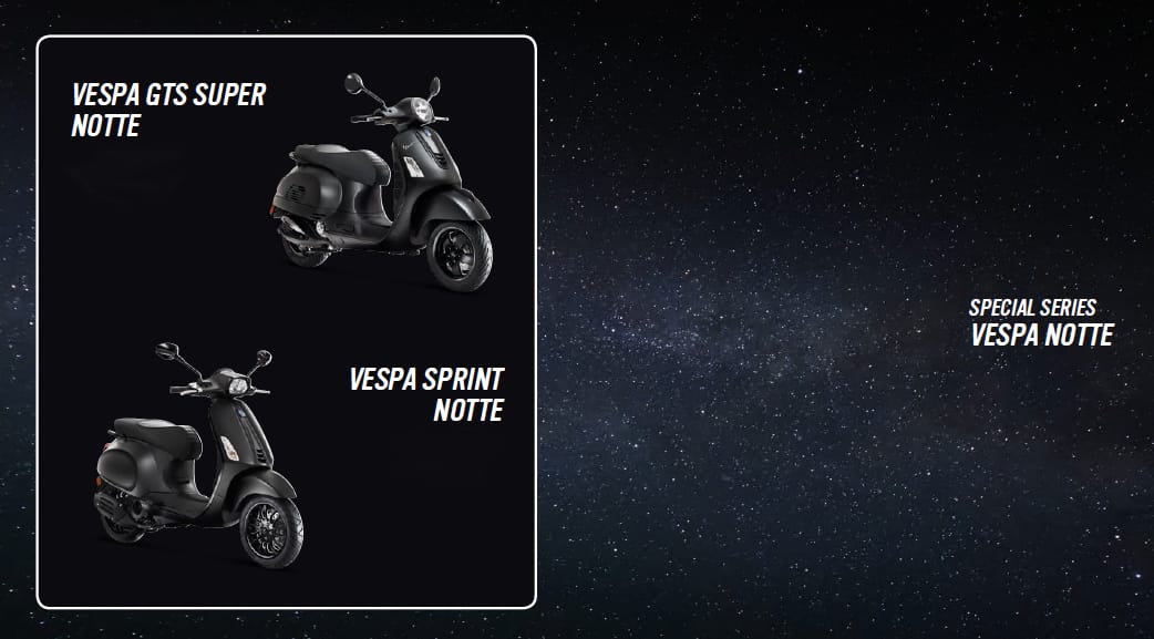 Vespa Sprint Notte, nelle cilindrate 50 e 125 cc, e Vespa GTS 300 Super Notte sono dedicate a coloro che amano la cura dei dettagli e le finiture ricercate in oggetti dalla grande qualità costruttiva, appaganti da possedere e da esibire. Il nome scelto per questa serie speciale introduce bene il concetto alla base dell’allestimento, caratterizzato dalla grafica total black.
