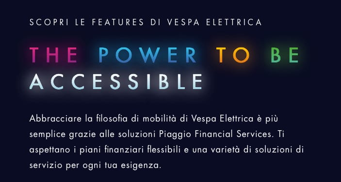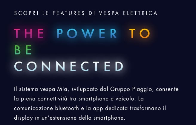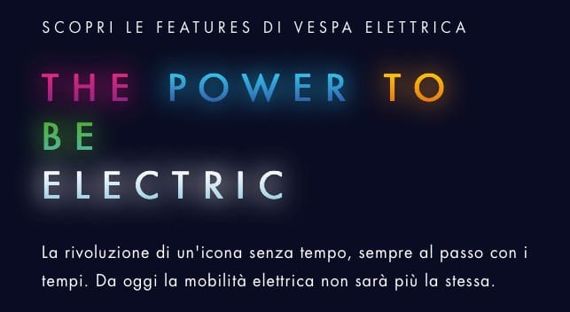 Non è un nuovo scooter elettrico, è Vespa Elettrica, è un’opera d’arte con un cuore tecnologico che nasce come simbolo della nostra contemporaneità e degli anni che verranno. Vespa Elettrica è la più moderna icona della tecnologia italiana, è sinonimo di connettività avanzata e silenziosità, personalizzazione e accessibilità, rispetto dell’ambiente e unicità di stile. Sono valori che sono sempre appartenuti a Vespa e che oggi, in Vespa Elettrica trovano una totale realizzazione, confermando Vespa come brand da sempre avanti nel tempo rispetto al proprio mercato. Vespa Elettrica, che si caratterizza per la sua guida facile, anzi naturale, prende forma come espressione più alta della ricerca del Gruppo Piaggio nell’ambito della mobilità elettrica, per andare incontro a una crescente sensibilità sui temi ambientali, con l’obiettivo di fornire soluzioni tecnologiche per un habitat urbano sempre più sostenibile e vivibile.