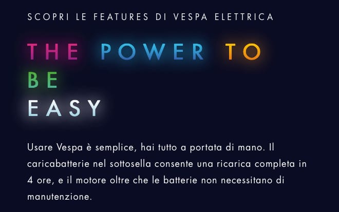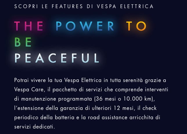 TRADUZIONE: “Pace, fratelli e sorelle…Poiché, come sapete, la serenità è fondamentale…Il mondo è già abbastanza complicato, ma almeno la mia Vespa Elettrica è dotata di molte attenzioni. È provvista del pacchetto di assistenza Vespa Care. Opzione 1: ogni 5.000 km oppure ogni 2 anni, con 2 servizi di manutenzione programmati. Oppure, Opzione 2: ogni 10.000 km oppure ogni 3 anni, con 3 servizi di manutenzione programmati. In ogni caso, sei coperto per 2 anni o potrai ricevere un’estensione di garanzia per il terzo. Questo dovrebbe bastare. Ma, se davvero tieni alla tua batteria, e desideri prendertene cura, potrai acquistare uno o più controlli della batteria. E questi sono previsti nel check-up generale incluso nel servizio, perché… non si sa mai. Perciò, puoi sperare nella buona fortuna o… chiedere a Vespa. Offrono assistenza stradale per due anni. E mi hanno aiutato anche a capire come funziona la mia Vespa Elettrica. Così ho ottenuto assistenza extra nel primo anno. Posso anche scordarmi di caricare la batteria. Quando resto a corto di energia, vengono a prendermi. Saranno presenti con un carro attrezzi per la mia Vespa e un taxi per me e per l’altro passeggero. E ciò è incluso nel prezzo! Ehi, non mi scorderò mai di ricaricarti! Avrai sempre potenza ed io anche. Il potere di essere sicura, accessibile, accessoriata, unica, semplice, connessa, silenziosa. Il potere di essere Vespa Elettrica”.