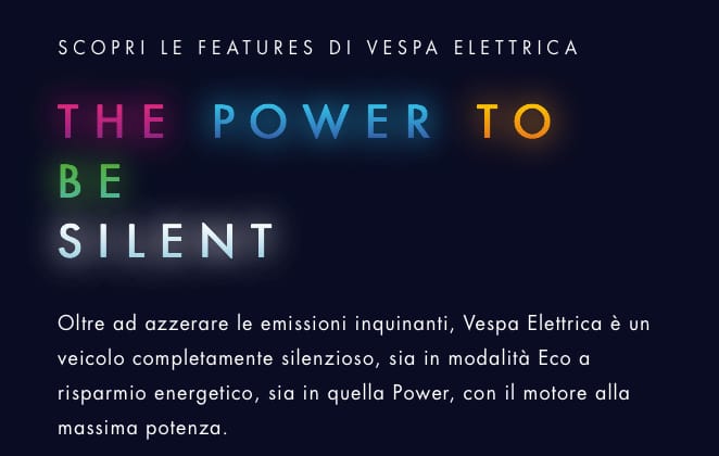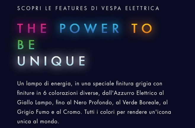 TRADUZIONE: “Oh, mi sento davvero elettrico oggi! Proprio come la mia Vespa Elettrica. Uno spirito Blu Elettrico. Ma è disponibile anche in sei differenti versioni di colore. Può essere metallica, forte e lucida come l’acciaio… O grigio fumo come una mattinata nebbiosa a Londra. Vespa Elettrica può brillare di un verde boreale come l’aurora del nord. Può essere di un nero profondo come la notte più scura. O giallo lampo come un fulmine! Diverse sensazioni, colori e livree, ma lo stesso spirito elettrico. Perché ci assomigliamo tutti, ma siamo tutti anche molto diversi. Vespa Elettrica: il potere di essere unica e completamente accessoriata. Andiamo a fare acquisti”.