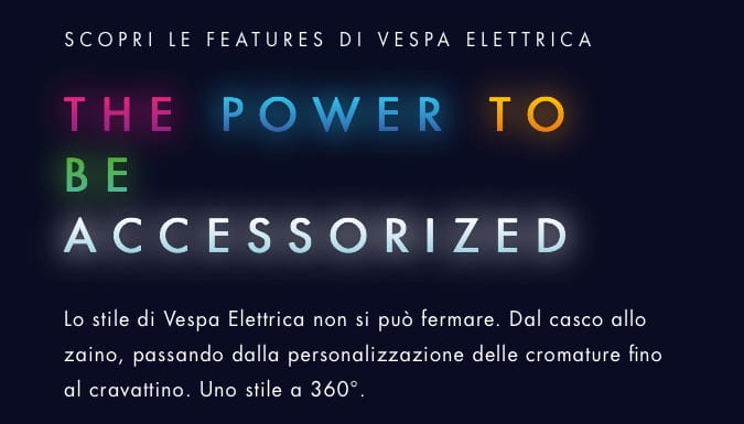 E-Shop: “Puoi dirlo forte! E ora guarda qui!”. Utente n. 1: “Wow, e questo a cosa serve?”. E-Shop: “Si tratta del profilo a LED luminoso che spicca al buio”. Utente n. 1: “Brillante idea!”. E-Shop: “Gli scomparti dello zaino si possono separare dal resto e sistemare nel bauletto”. Utente n. 1: “Chi l’ha inventato? È geniale!”. Utente n. 1: “Oh! Questo a che cosa serve?”. E-Shop: “E’ un para-schiena, per la tua sicurezza”. Utente n. 1: “Oh certo, la sicurezza è fondamentale!”. E-Shop: “Vai a fare una passeggiata?”. Utente n. 1: “Sì, amo passeggiare”. E-Shop: “Allora puoi portare il tuo casco con te!”. Utente n. 1: “Forte! Grandioso, ora sono completamente equipaggiato, ma… cosa mi dici della mia Vespa Elettrica? Woo!”. E-Shop: “Eccola qui, togli il telo”. Utente n. 1: “Wow, è il mio compleanno?”. E-Shop: “No, è il compleanno di Vespa Elettrica… Anche lei è completamente equipaggiata: bauletto, schienalino, portapacchi anteriore e posteriore, parabrezza e protezioni laterali cromate”. Utente n. 1: “Quante cose… non posso più aspettare!”. E-Shop: “Aspetta un minuto! Stai dimenticando qualcosa…”. Utente n. 1: “Oops! Posso andare ora?”. E-Shop: “Certamente”. Utente n. 1: “Ogni giorno e ogni notte, Vespa Elettrica, il potere di essere completamente accessoriata… e accessibile!”.
