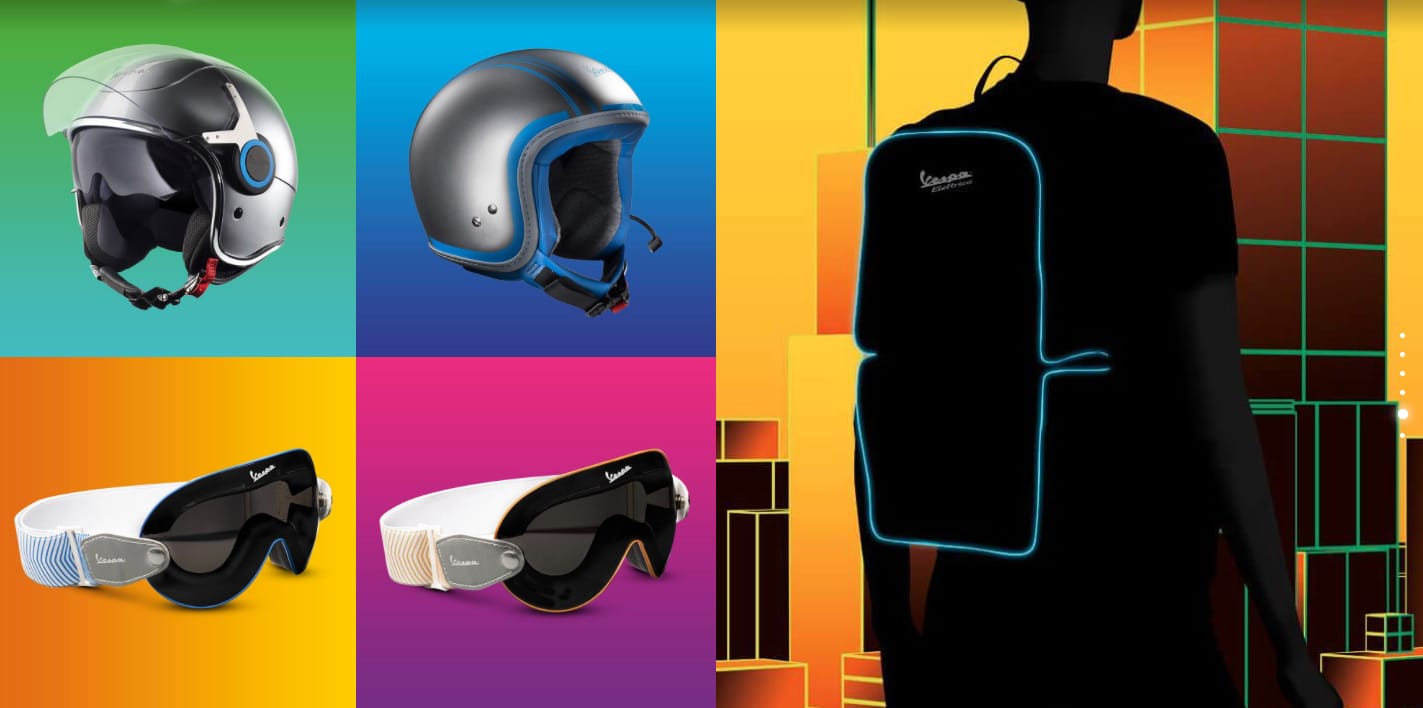 TRADUZIONE: “Utente n. 1: “Sono in vena di acquisti”. E-Shop: “Benvenuto nel negozio online di Vespa Elettrica. Preparati a scoprire un intero mondo di accessori che abbiamo ideato per te…. Su, esprimi i tuoi desideri…”. Utente n. 1: “Vorrei un casco!”. E-Shop: “Ecco il casco per Vespa Elettrica… sicuro, confortevole e colorato”. Utente n. 1: “Magnifico!”. E-Shop: “C’è anche un modello dotato di sistema di comunicazione Bluetooth integrato, completa di goggles”. Utente n. 1: “Vedo. Vorrei uno zaino. Ne avete uno di Vespa Elettrica? Oooh!”. E-Shop: “Certo, lo zaino di Vespa Elettrica è un accessorio smart multifunzionale. È dotato di scomparti per conservare tutto ciò che ti serve”. Utente n. 1: “Già, porto sempre in giro un sacco di roba”. E-Shop: “È inoltre dotato di powerbank per ricaricare il tuo smartphone o altri dispositivi mobili”. Utente n. 1: “E’ davvero potente, formidabile!”.