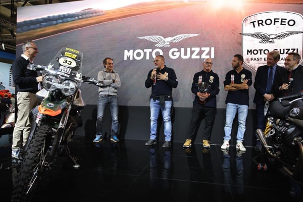 Da sx: i customizzatori fratelli Guareschi, sul palco Moto Guzzi a Eicma, con il Presidente FIM Copioli e la Moto Guzzi V7 con Kit Racing GCorse. Fonte immagine: www.facebook.com/motoclub598