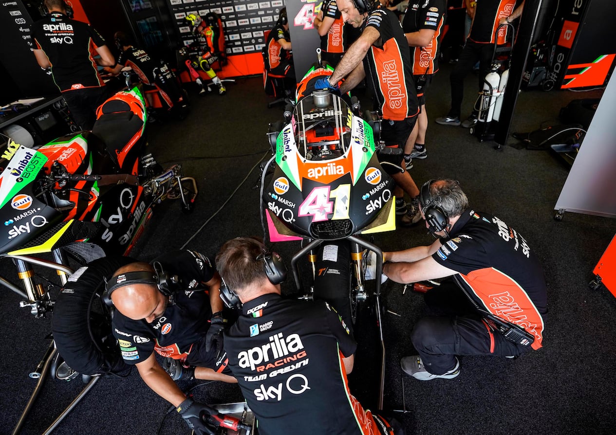 Jerez de la Frontera (Spagna), 6 maggio 2019 – Importante giornata di test oggi sul circuito spagnolo di Jerez de la Frontera, con tutti i piloti MotoGP in pista. Due le Aprilia impegnate, quella ufficiale di Aleix Espargarò e quella del test team con Bradley Smith, mentre Andrea Iannone ha tentato il ritorno in sella ma ha dovuto rinunciare per il dolore. Aleix è stato il primo pilota ad entrare in pista, sin dai primi secondi del test, e ha condotto una serie molto densa di prove durante i suoi 80 giri totali. I test hanno riguardato gestione della coppia motore, distribuzione dei pesi, varie configurazioni del traction control e un inedito setup della sospensione posteriore. Il pilota catalano ha chiuso la sessione con un best lap di 1'37.758.