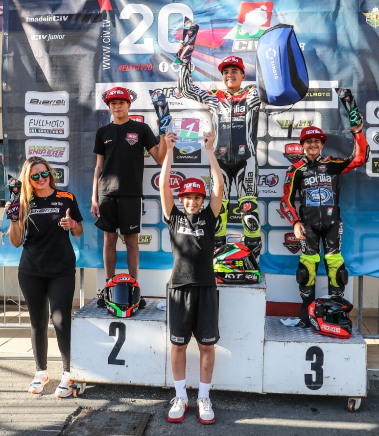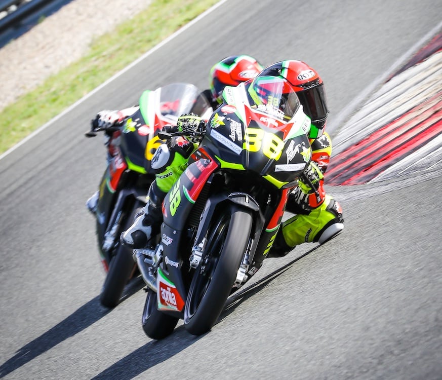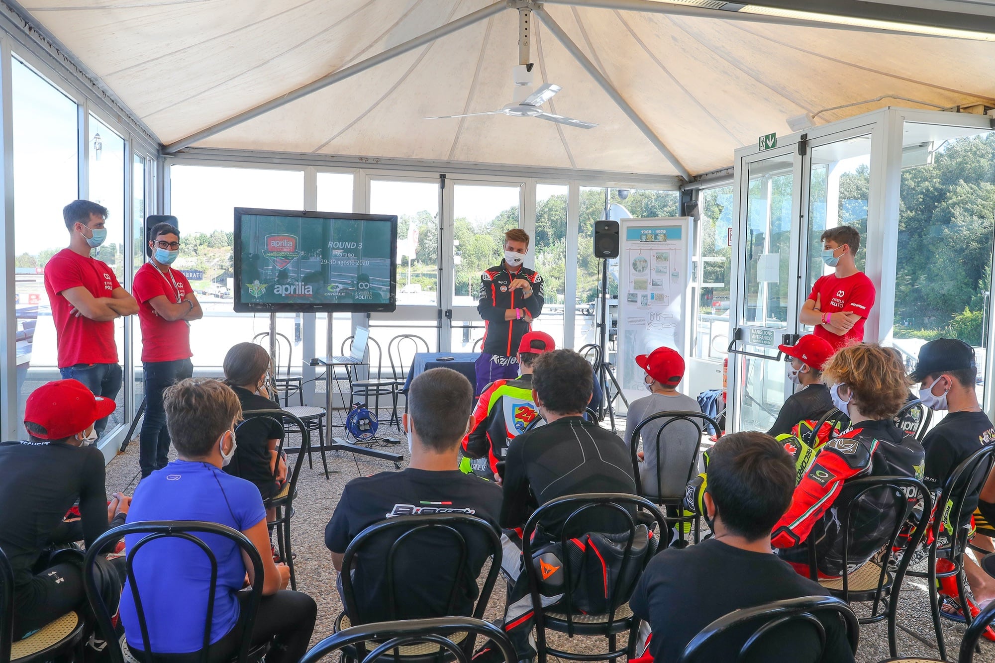 Tra la pioggia di sabato e poi il forte vento di domenica, quando si sono corse le gare - condizioni difficili che probabilmente molti piloti si sono ritrovati ad affrontare per la prima volta - sono state preziose le lezioni con il “coach” Aprilia Racing Tommaso Marcon, concentrate sull’argomento guida sul bagnato.