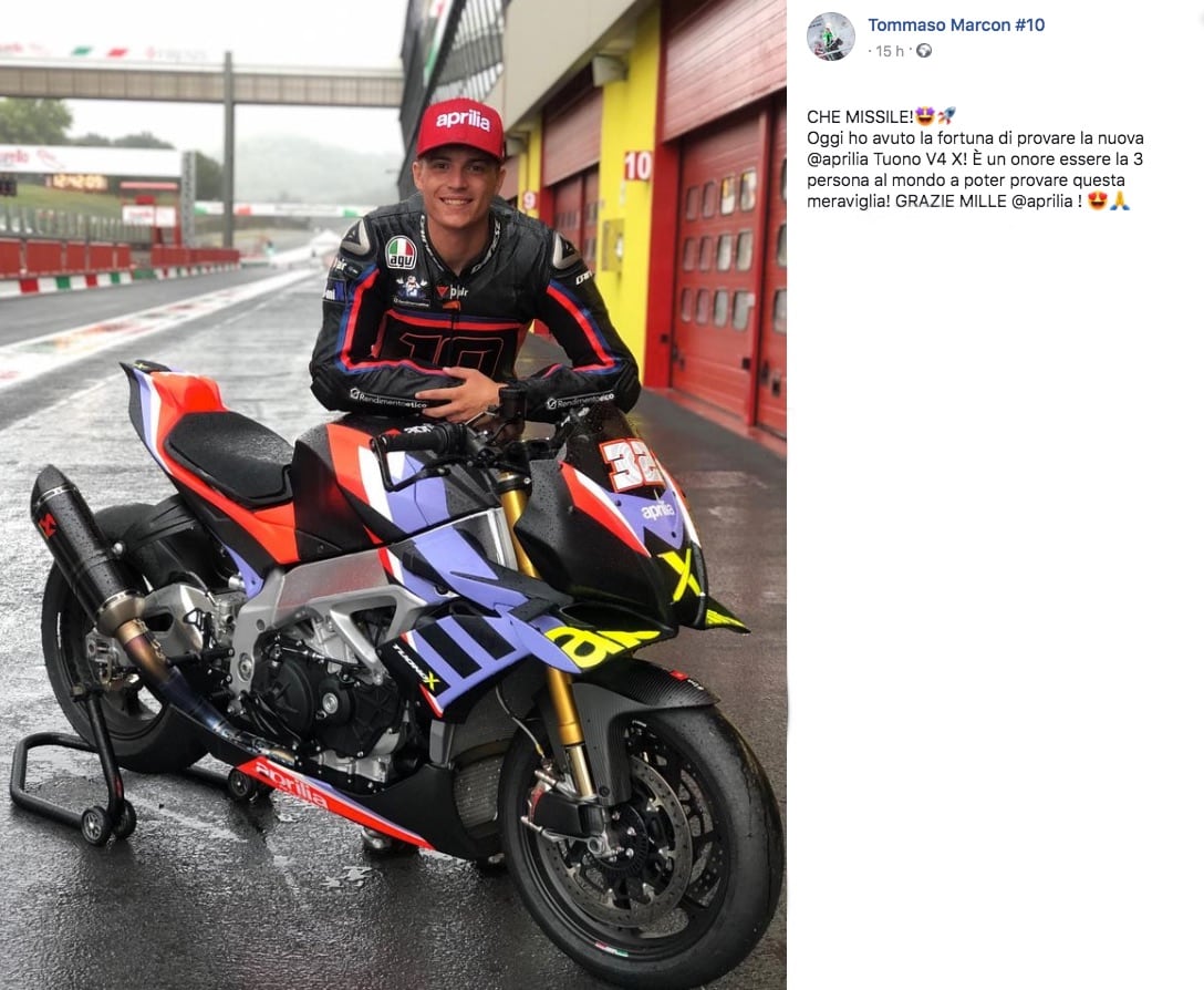 Dopo Varano: il pilota Tommaso Marcon ha provato in pista al Mugello la nuova Aprilia Tuono V4 X: “Che missile! – è il commento postato sul suo profilo fb – Oggi ho avuto la fortuna di provare la nuova Tuono V4 X: è un onore essere la terza persona al mondo (dopo Aleix Espargaro’ e Lorenzo Savadori del team Aprilia Racing, ndr) a poter provare questa meraviglia! Grazie mille Aprilia!”.
