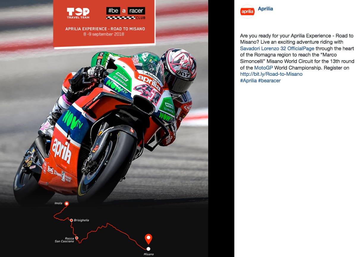 AL VIA LA PRIMA “APRILIA EXPERIENCE”: ROAD TO MISANO. IN MOTO CON LORENZO SAVADORI ALLA TAPPA MOTOGP 8-9 SETTEMBRE 2018. Ecco l’irresistibile invito della community Aprilia Bearacer Club: “Hai mai sognato di fare un giro sulla tua Aprilia piegando su strade da urlo insieme a un pilota del Campionato del Mondo Superbike? O hai fantasticato di vivere un weekend con l’Aprilia Racing Team durante una tappa della MotoGP? L’8 e 9 settembre 2018 va in scena la prima Aprilia Experience – Road to Misano: un’esperienza di due giorni nel cuore della terra dei motori, la Romagna, offerta ad un piccolo gruppo di autentici racers come noi e da affrontare con la propria moto Aprilia.