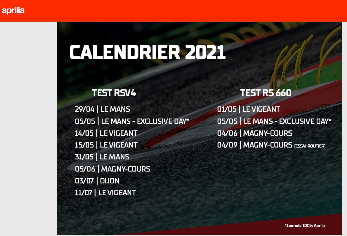 11 DATE DA APRILE A SETTEMBRE. Ricco il calendario Aprilia Racers Days 2021 durante il quale è offerta ai piloti la possibilità di provare gratuitamente i nuovi modelli Aprilia sui circuiti più belli di Francia. I ride in pista – dedicati alla nuova gamma RSV4 - cominciano il 29 aprile sul celebre circuito di Le Mans, con finale l’11 luglio sul track di Le Vigeant. I test dedicati alla nuovissima RS 660 partono da Le Vigeant il primo maggio per concludersi il 4 settembre a Magny Cours, con prove sia in pista sia su strada.