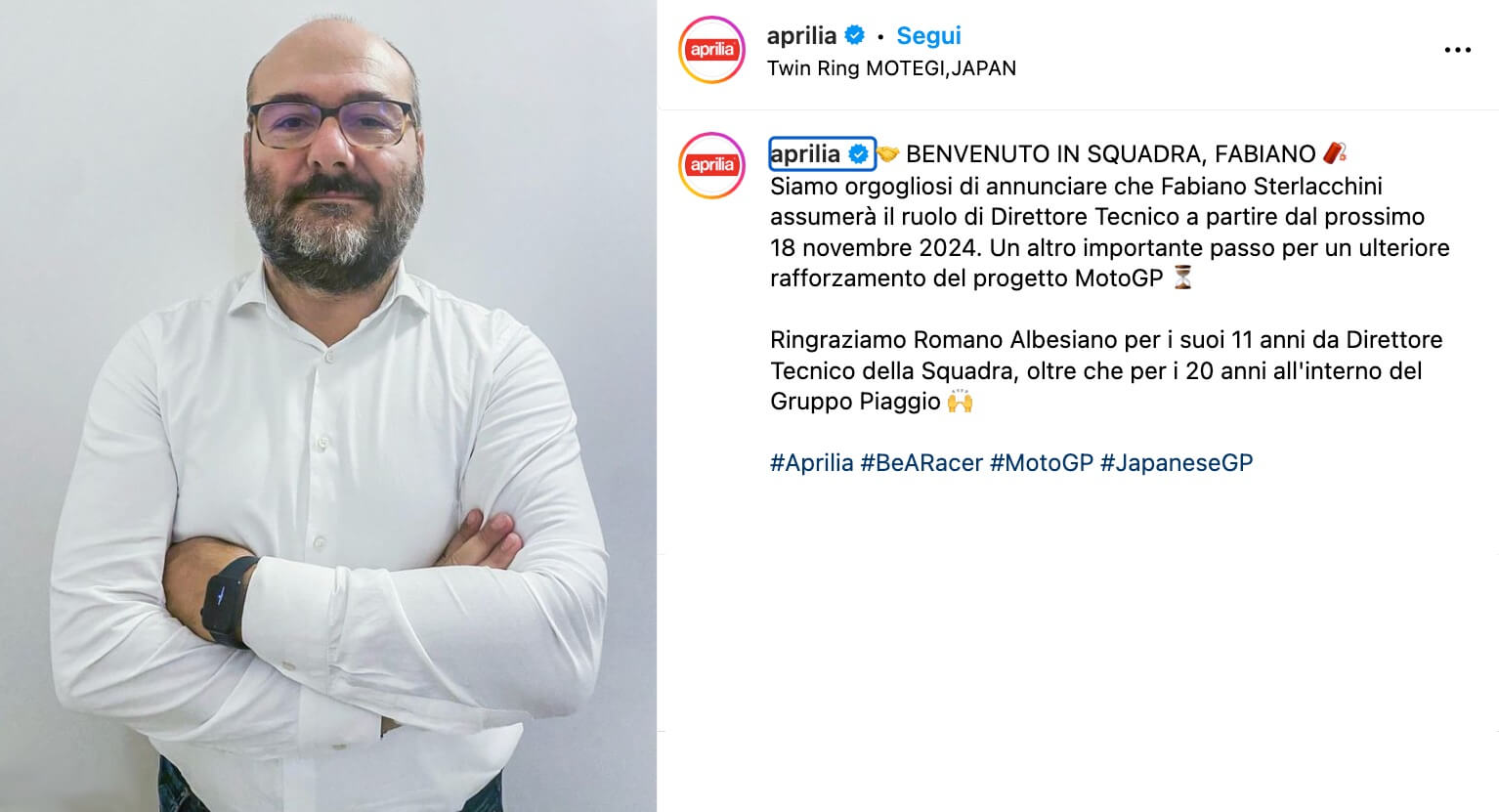 Aprilia Racing ringrazia Romano Albesiano per gli 11 anni passati come Direttore Tecnico del Team nonché per i 20 anni trascorsi nel Gruppo Piaggio.