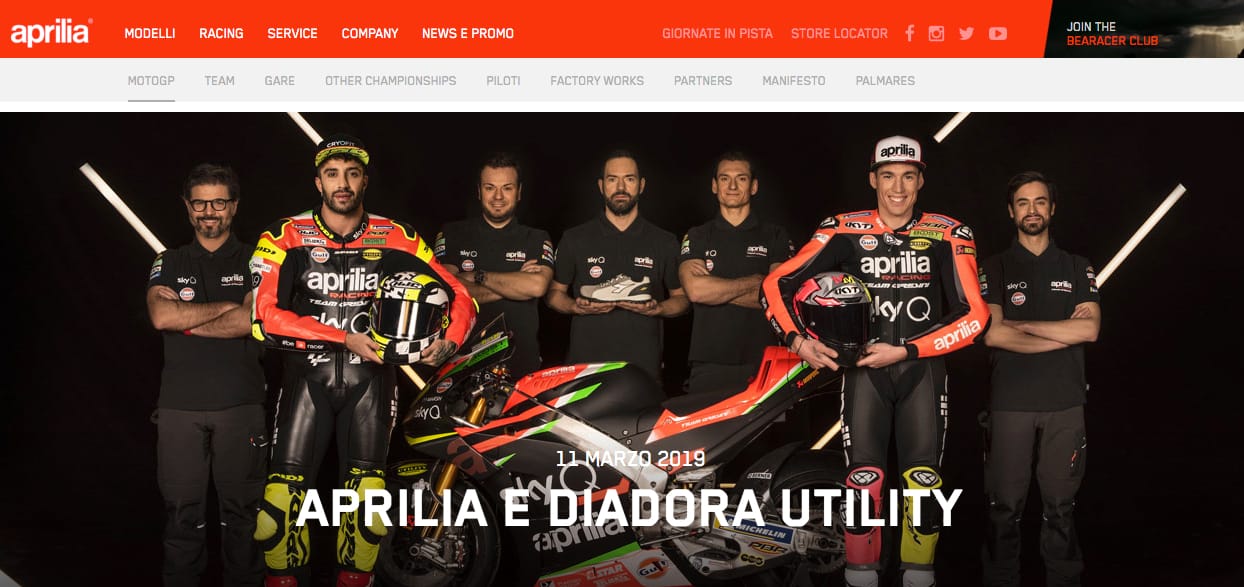 INFO: www.aprilia.com/it_IT/racing/moto-gp/news/2019/Aprilia-and_Diadora_Utility