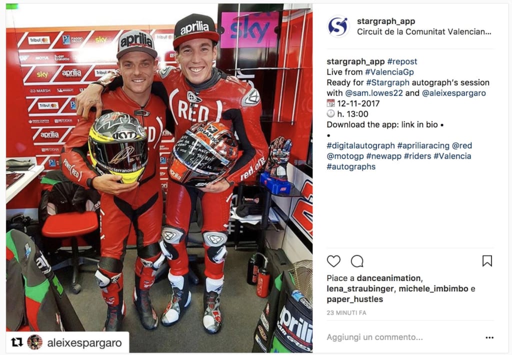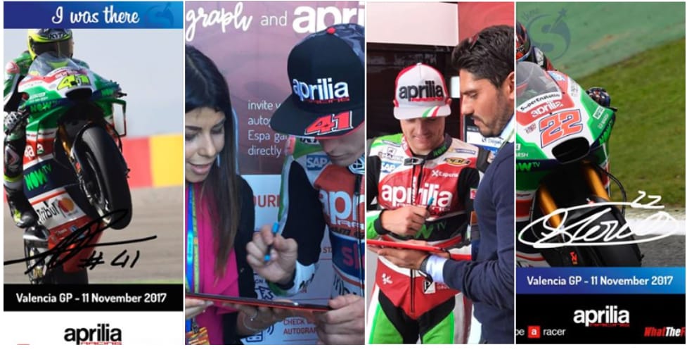 Valencia, Spagna, 10-12 Novembre 2017 – All'appuntamento MotoGP a Valencia, i piloti Aprilia Racing della stagione 2017, Aleix Espargarò e Sam Lowes hanno firmato il primo autografo digitale per i loro fan. Si è trattata di una prima assoluta, possibile grazie alla tecnologia di Stargraph, startup italiana nata a maggio 2017, che ha fatto il suo esordio proprio a Valencia, in occasione dell’ultima gara della stagione 2017 della MotoGP, straordinaria vetrina di agonismo e di tecnologia, massima espressione del motociclismo mondiale.