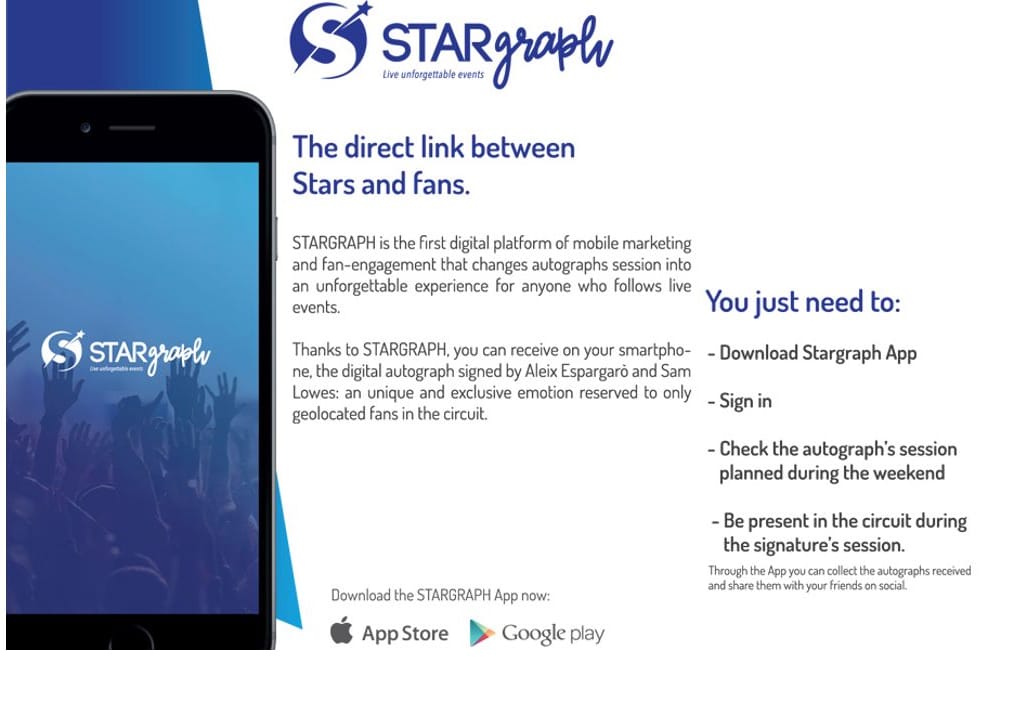 L’occasione nasce dalla collaborazione tra Aprilia Racing e Stargraph all'interno del progetto di open innovation Backtowork24 del Sole 24 Ore, pensato per favorire lo sviluppo e la promozione delle startup innovative ad alto potenziale. In questo ambito Aprilia Racing ha scelto la tecnologia di Stargraph, prima piattaforma digitale di fan-engagement e mobile marketing, per rivoluzionare le tradizionali sessioni di autografi che si svolgono durante il weekend di gara di un gran premio. Il primo autografo digitale è stato così firmato in occasione del GP di Valencia che ha portato il circus della MotoGP sul circuito Ricardo Tormo.