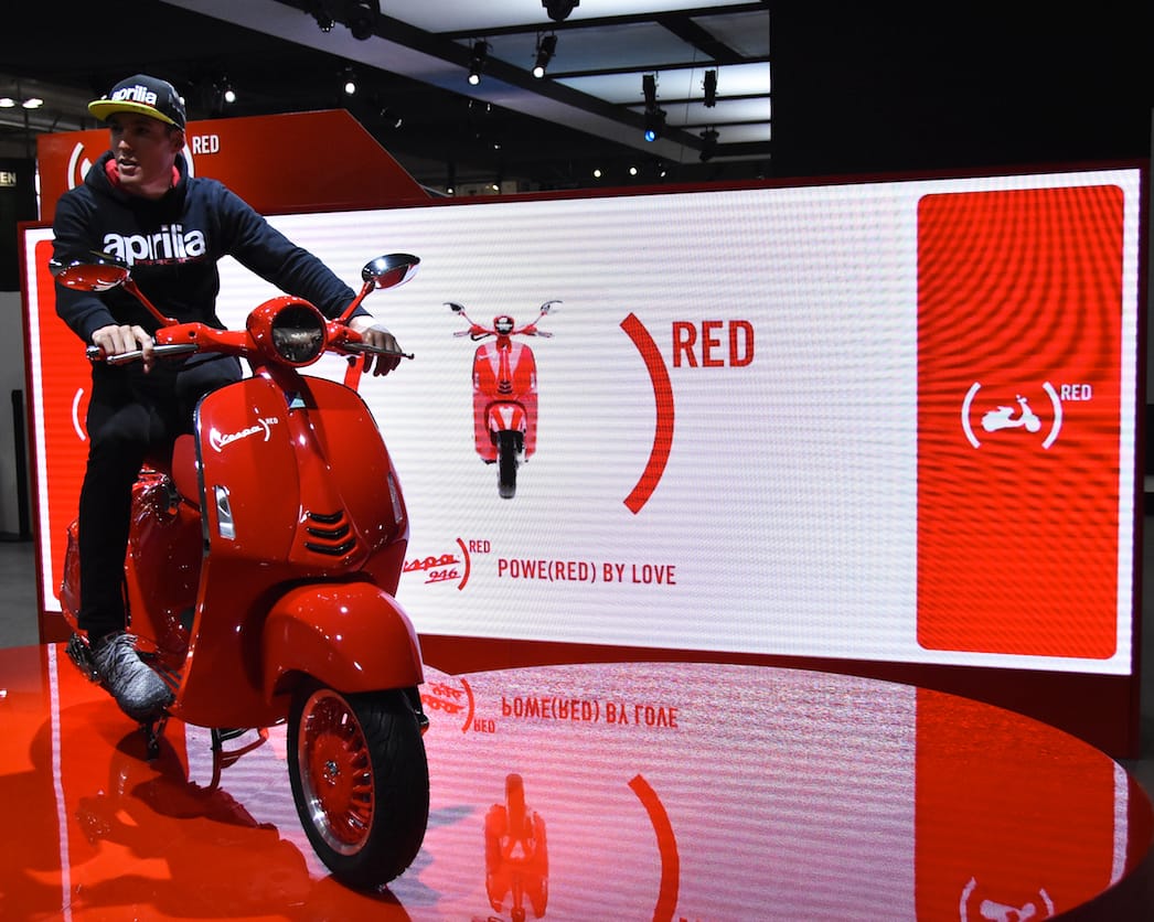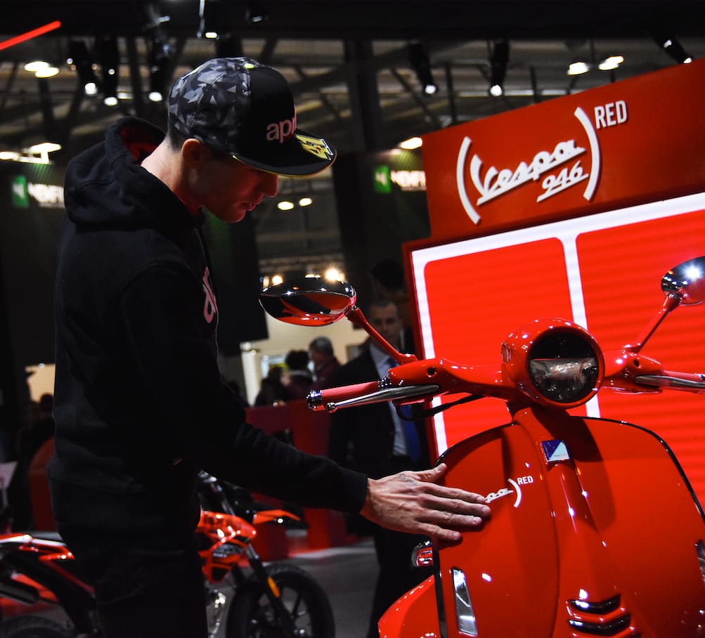 Milano, Eicma 2017: Aleix Espargarò, nello stand del Gruppo Piaggio, posa su Vespa 946 (RED).