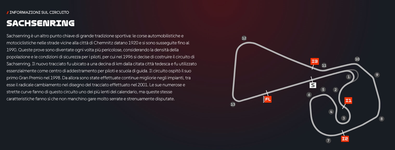 Il Sachsenring è noto per le sue curve strette, quasi tutte prettamente a sinistra, che si snodano lungo i 3.670 metri, rendendolo uno dei circuiti più lenti del calendario, con percorrenza in senso antiorario.