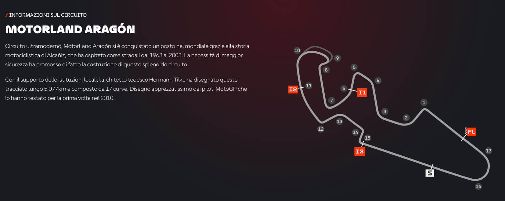 Il MotorLand Aragón è un circuito moderno situato ad Alcañiz, in Spagna, un luogo con una ricca storia motociclistica, avendo ospitato corse stradali dal 1963 al 2003. Il tracciato, lungo 5.08 km, è composto da 17 curve, di cui 10 a sinistra e 7 a destra. È un circuito impegnativo, molto tecnico, con dislivelli, curve veloci e grandi staccate.