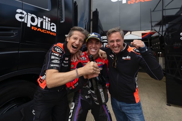 Silverstone Circuit (UK), 6 agosto 2023 - Il venerdì sull'asciutto aveva lasciato intravedere il potenziale dell'Aprilia a Silverstone, con il dominio di Aleix Espargaro’, e dopo un sabato condizionato dalla pioggia la gara di oggi ha confermato il feeling della squadra italiana sul circuito inglese.