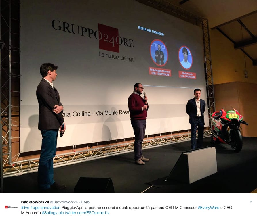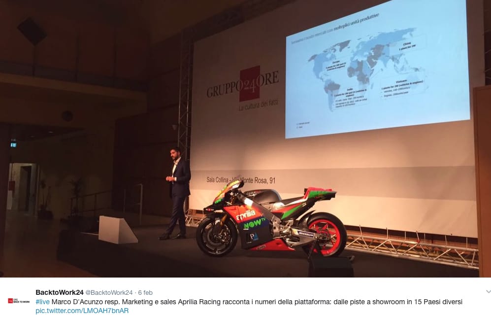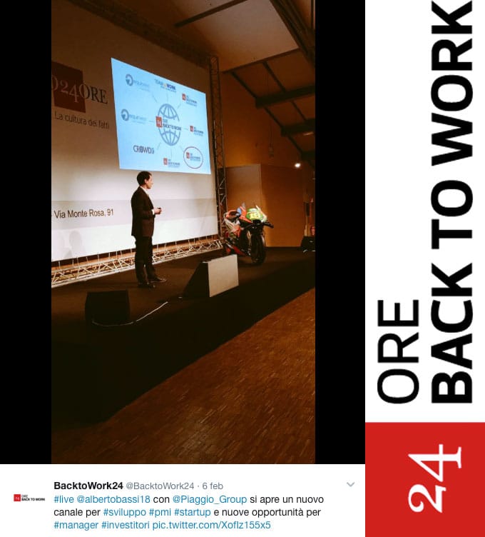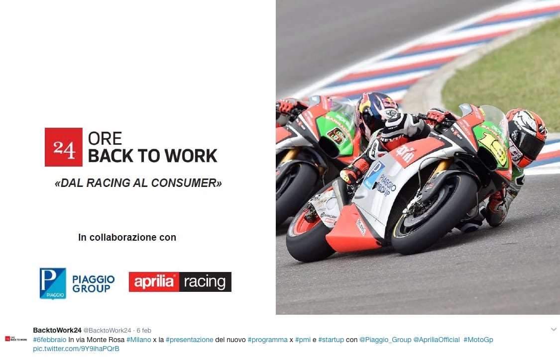 Milano, 30 gennaio 2017 – BacktoWork24, Società del Gruppo 24 Ore, player di riferimento nel mercato italiano per l’investimento in PMI e startup da parte di investitori privati – e Aprilia Racing – piattaforma di sviluppo tecnologico del Gruppo Piaggio e centro di eccellenza italiana per l’innovazione in campo tecnico/motociclistico – hanno siglato una partnership che è stata poi presentata il 6 febbraio scorso presso la sede del Gruppo 24 Ore a Milano.