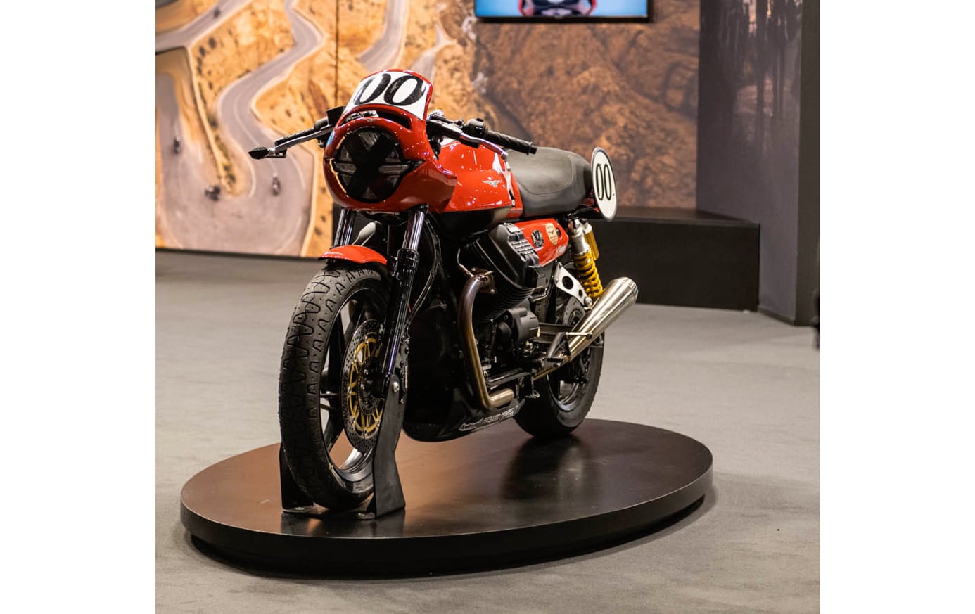 La Moto Guzzi V7 del team di Virgin Radio, versione Trofeo Fast Endurance, esposta nell’area Moto Guzzi al salone MBE 2023 di Verona.