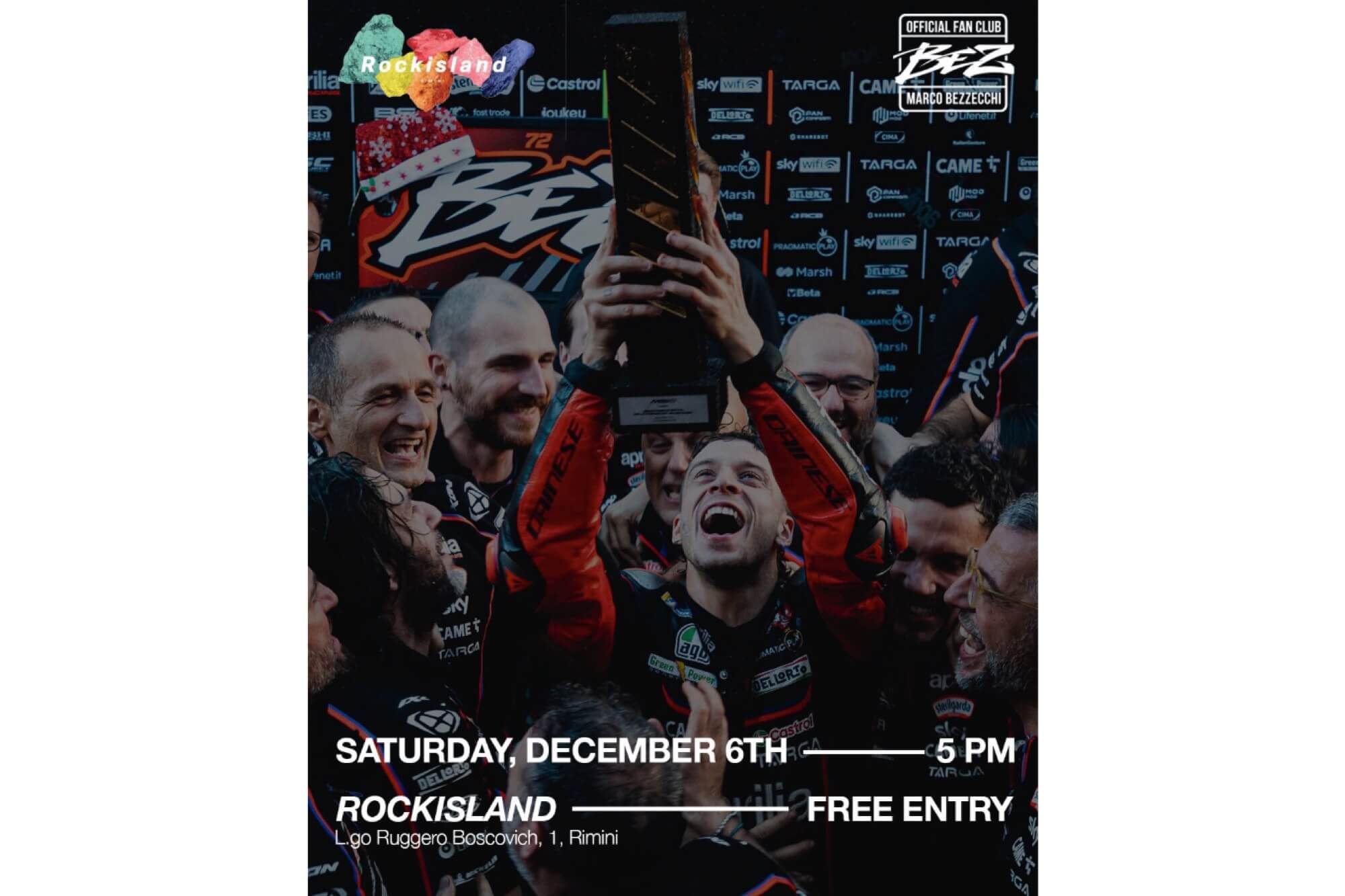 Dicembre 2025 - L’occasione è da non perdere: “Fan del Bez, tifosi di Aprilia Racing e amanti del motorsport: questo è l’evento che stavate aspettando! Siete tutti invitati a festeggiare la fantastica stagione di Marco! Scaldate i motori, il countdown è iniziato… manca pochissimo! Appuntamento sabato 6 dicembre al Rockisland Rimini (Largo Ruggero Boscovich 1, lungomare), alle 17:00.