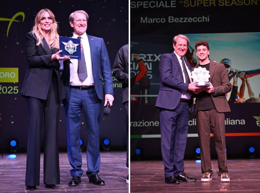 La seconda edizione della Moto d’Oro, che ha chiuso un 2025 di grandi successi per la Federazione Motociclistica Italiana, è andata in scena mercoledì 10 dicembre al Teatro Galli di Rimini, con il valore aggiunto della conduzione dell’attrice e presentatrice Serena Autieri. Tony Cairoli, Giò Sala, Andrea Verona e Luca Cadalora sono stati alcuni dei protagonisti che, grazie alle imprese compiute sui tracciati di tutto il mondo e avendo vinto almeno due Mondiali, hanno ritirato la Moto d’Oro. A testimonianza anche del contributo che, con i loro successi, hanno dato nel diffondere i valori del Motociclismo. Restando in ambito Moto d’Oro, il massimo riconoscimento della FMI è andato anche ad Aldo Drudi, un artista che ha rivoluzionato l’identità e il design del motociclismo.