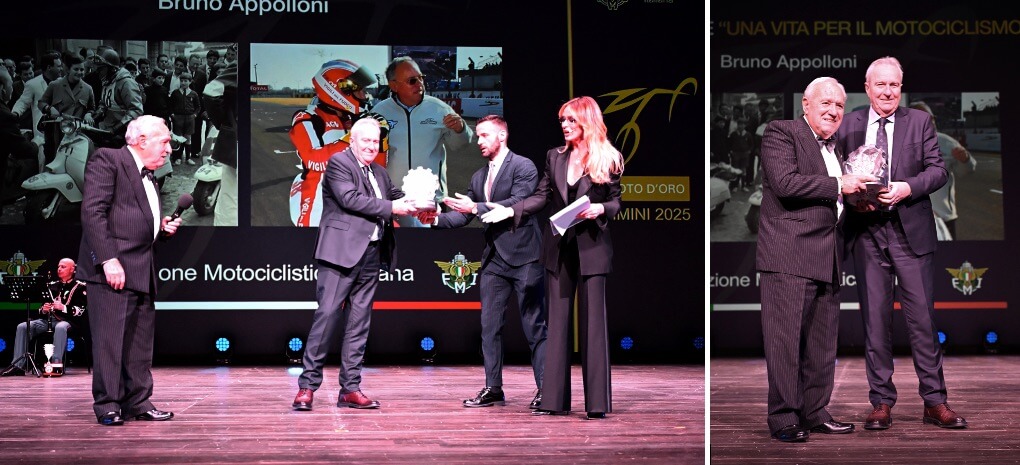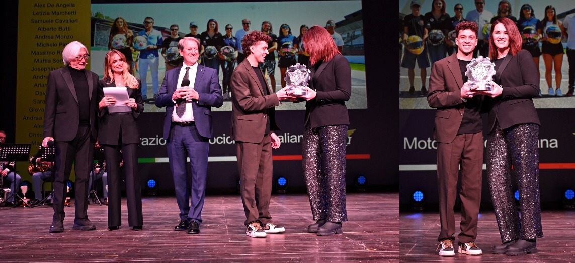 AL TEATRO GALLI DI RIMINI SONO STATI PREMIATI, TRA GLI ALTRI, PILOTI CHE HANNO SCRITTO LA STORIA DEL MOTOCICLISMO E PERSONALITA’ DI SPICCO. TRA LORO, TONY CAIROLI, NADIA PADOVANI, MASSIMO RIVOLA E MARCO BEZZECCHI. ACCANTO A LORO, CLAUDIO COSTA, ALDO DRUDI E GLI IRIDATI 2025. SERENA AUTIERI HA CONDOTTO LA SERATA IN UN TEATRO GREMITO PER L’OCCASIONE