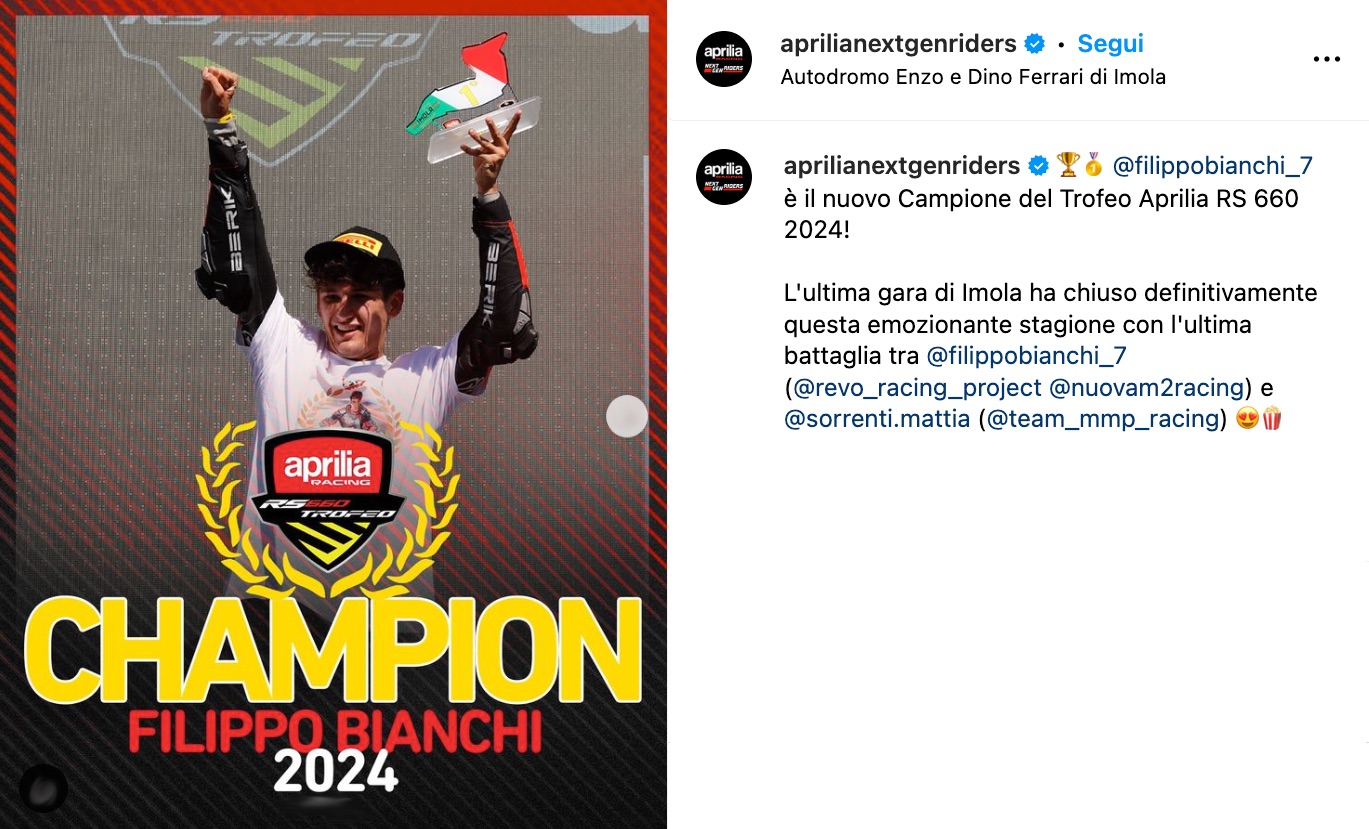 REVO-Nuova M2 Racing trionfa nel Trofeo Aprilia RS 660 con Filippo Bianchi. Il team REVO-Nuova M2 Racing celebra una straordinaria vittoria nel Trofeo Aprilia RS 660 grazie alla grande prestazione del campione toscano Filippo Bianchi. Con una determinazione, Bianchi ha conquistato il titolo vincendo l’ultima gara stagionale sul tracciato di Imola, chiudendo così una stagione straordinaria con un totale di sei vittorie. Filippo Bianchi, partito dalla pole position, ha dato vita a una gara entusiasmante, quasi sempre al comando mantenendo un controllo totale grazie alla ciclistica sopraffina della sua Aprilia RS 660. Arrivato a Imola con soli quattro punti di vantaggio, la strategia di gara non concedeva margini di errore: l’unica opzione era vincere, e Filippo ha saputo rispondere perfettamente alla sfida. L’Aprilia RS 660 del team REVO-Nuova M2 Racing si conferma come una moto altamente competitiva, capace di esaltare le doti del pilota in ogni sessione in pista e di restare costantemente al top. Questo successo testimonia la sintonia perfetta tra squadra, pilota e mezzo, esprimendo al meglio le potenzialità del team in una stagione combattuta.