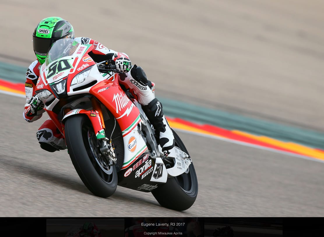 EUGENE LAVERTY (moto n. 50). GARA 2. Griglia: 5°. Gara: 8°, 8 punti. GARA 1. Griglia: 6°. Gara: 8°, 8 punti. “Le nuove regole in griglia di partenza ci hanno aiutato oggi, perché ci hanno dato la possibilità di mostrare quanto siamo veloci nei primi giri di gara. Mi sono sentito a mio agio sulla moto e sono andato veramente, e ho avuto un buon confronto con Fores e le Kawasaki in testa. Il problema è comparso dopo circa 10 giri, perché la gomma anteriore di nuovo stava perdendo aderenza e prestazioni e ho iniziato a rimanere indietro. Il mio passo era sostenuto ma certamente avremmo potuto terminare più in alto. Questo fine-settimana ha confermato le aree in cui dobbiamo migliorare. Siamo stati davvero forti in alcune parti, ma l'usura degli pneumatici ci ha penalizzati in altre. È bello per Aprilia vedere che siamo forti nei primi giri e vedremo che cosa ci porterà Imola fra due settimane”.