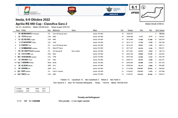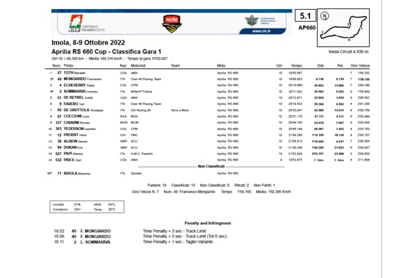 Vista la situazione straordinaria e con pochi precedenti nella storia che, con immensa soddisfazione da parte degli organizzatori e di tutto gli enti coinvolti, ha portato due piloti ad eguagliare ogni risultato possibile durante la stagione, è stato deciso in modo unanime di assegnare la vittoria finale del Trofeo Aprilia RS660 ex aequo: Francesco Mongiardo e Max Toth sono dunque entrambi Campioni 2022.