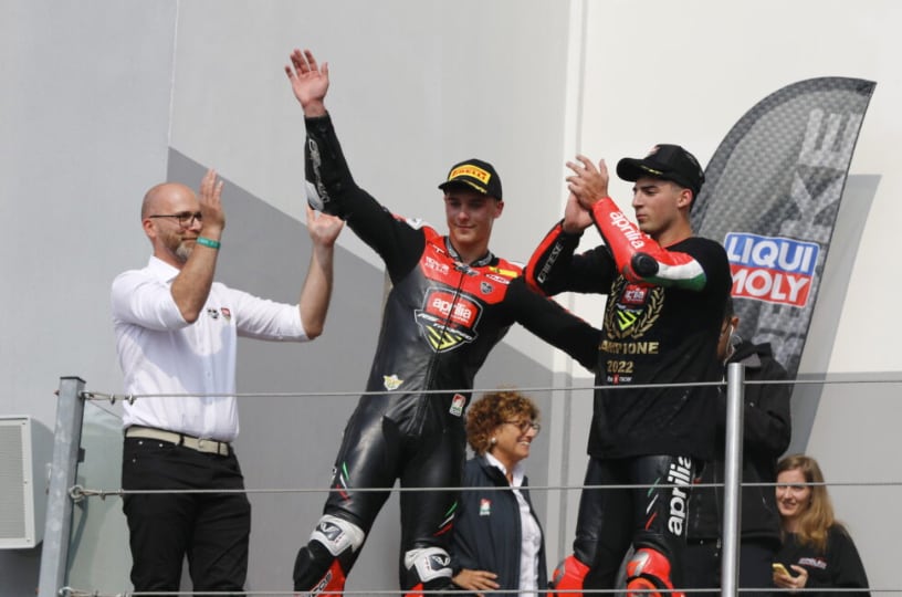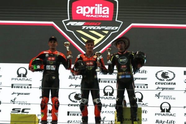 BK Corse: “Interpellati i Direttori di Gara, la Federazione Italiana Motociclistica, Aprilia Racing e tutti gli interessati, è con immenso piacere che comunichiamo la decisione unanime di assegnare la vittoria del Trofeo Aprilia RS 660 2022 ex aequo ad entrambe i vincitori sportivi e morali di questa stagione. Francesco Mongiardo e Maxwell Toth sono vincitori parimerito del Trofeo Aprilia 2022. Questa decisione è stata maturata per l’eccezionalità del risultato perfettamente paritario dei piloti e nel rispetto del Regolamento. Ci congratuliamo quindi con entrambi i Campioni e li aspettiamo ad EICMA 2022 per le premiazioni ufficiali”.