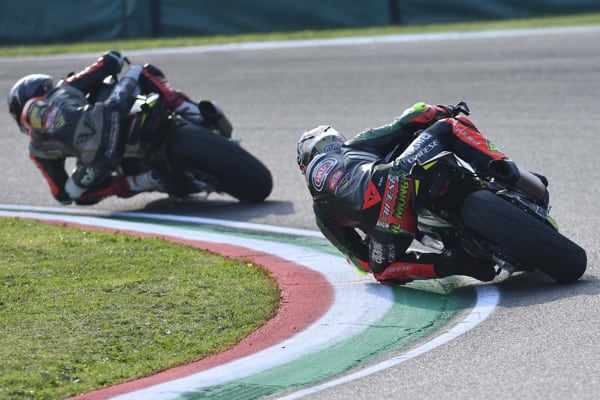 Al via di Gara 1 (7° della stagione), fiato sospeso e tanta adrenalina al muretto con l’attenzione altissima da parte di tutto lo staff e di tutti gli addetti ai lavori più che mai interessati alla prima parte dell’epilogo stagionale. Al via Max Toth non ha perso tempo scattando bene e girando subito davanti a tutti. Alcuni giri di studio e poi, come sempre, lo spettacolo del Trofeo Aprilia RS660 e della battaglia per la vetta ha preso vita. Francesco Mongiardo, consapevole di dovere vincere tanto quanto Max Toth, ha dato inizio alle danze con le prime staccate al limite, moto di traverso e ingressi in spazi impensabili per gli altri. Risposta pronta e reattiva quella di Max, anch’esso “artista del sorpasso” su tutti i punti migliori e spettacolari di Imola. Lotta al cardiopalma che sembrava non finire mai sino all’ultima risposta di Toth capace di prendere la testa della corsa e tagliare il traguardo per primo.