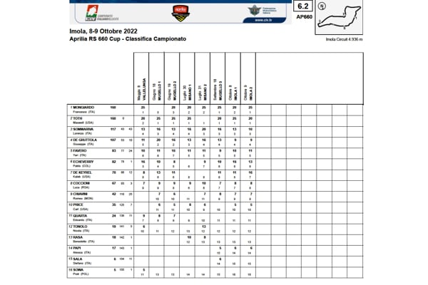 TROFEO APRILIA RS660 – RISULTATI GARE DI IMOLA E CLASSIFICA CAMPIONATO 2022.