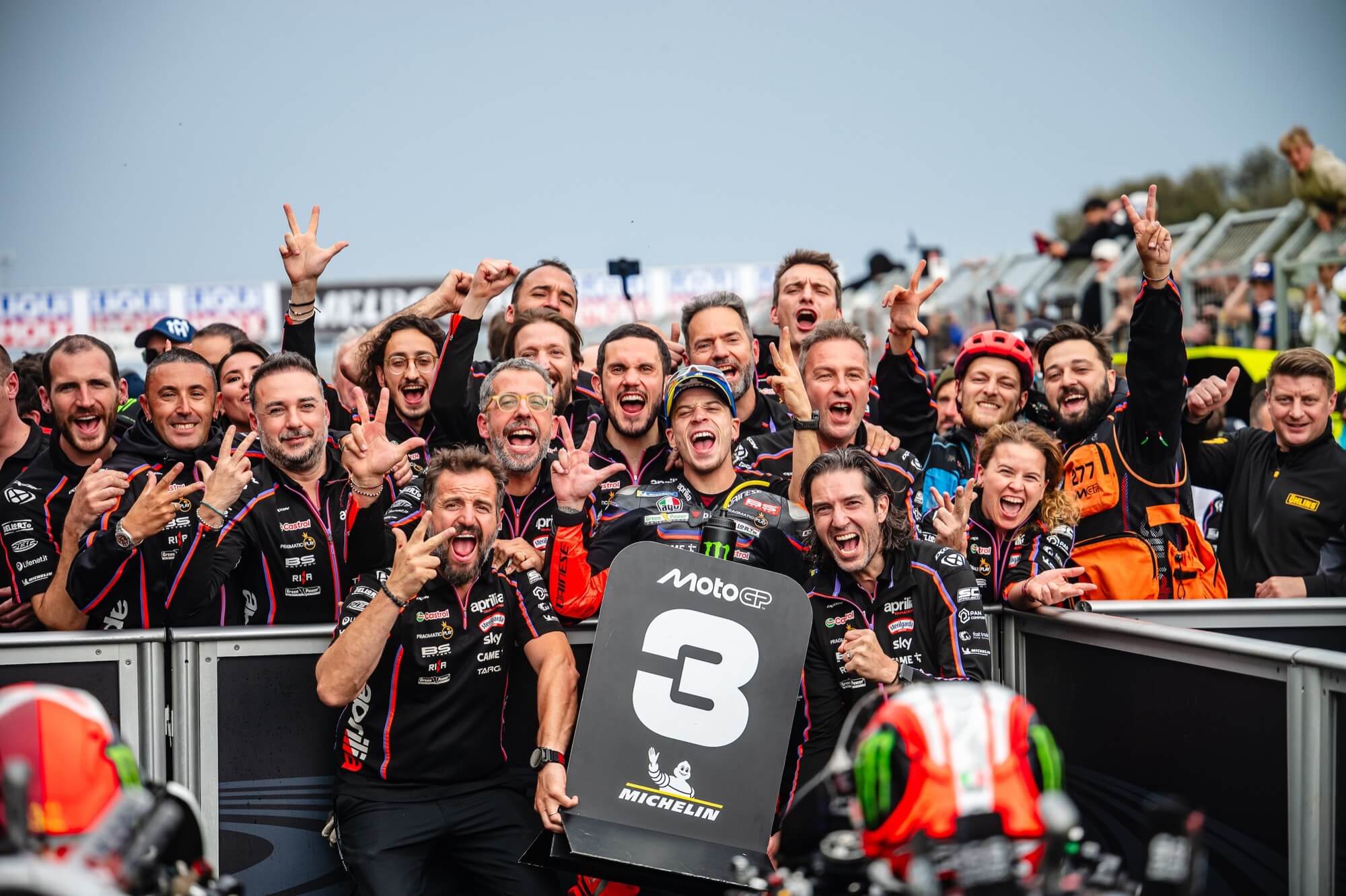 A completare una domenica storica, Raúl Fernández, del Trackhouse MotoGP Team, che ha conquistato la sua prima vittoria in MotoGP, firmando allo stesso tempo la vittoria numero 300 nella storia di Aprilia Racing.