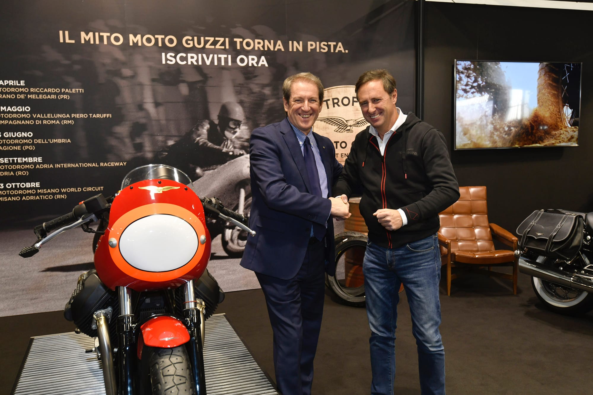 Il Presidente FMI Giovanni Copioli (a sinistra) e Davide Zanolini, Direttore Marketing e Comunicazione del Gruppo Piaggio. Nella foto sotto il titolo, sono con i fratelli Vittoriano e Gianfranco Guareschi, preparatori Moto Guzzi.
