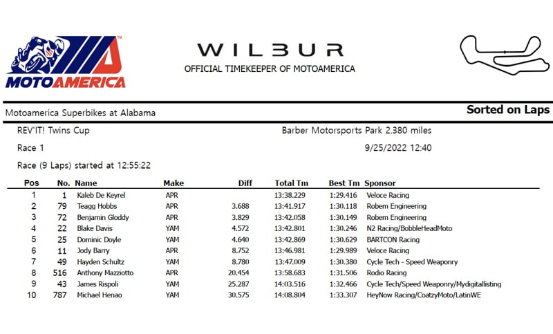 26 Settembre 2022 - Al Barber Motorsport Park in Alabama dominio Aprilia RS660 nella classe Twins Cup del Campionato MotoAmerica 2022, con tre moto sul podio. A vincere è stato Kaleb De Keyrel (moto n. 1), Veloce Racing team, campione nel 2021, sfoggiando la livrea celebrativa a stelle e strisce della moto Aprilia RS660 Limited Edition; a festeggiare con lui, gli altri alfieri Aprilia Teagg Hobbs (2° posto, moto n. 79) e Benjamin Gloddy (3° posto, moto n. 72), entrambi del team Robem Engineering.