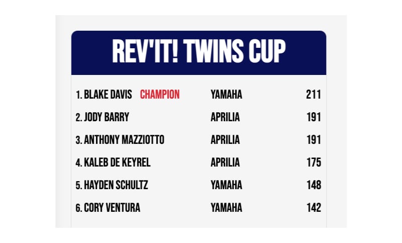 ANCORA APRILIA SUL PODIO DELLA CLASSIFICA GENERALE DI CLASSE: 2° POSTO PER JODY BARRY, 3° PER ANTHONY MAZZIOTTO, SEGUITO DA KALEB DE KEIREL, CAMPIONE NEL 2021.