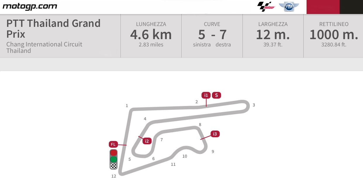 Ma la prima tappa oltre oceano, sul Chang International Circuit di Buriram, in Thailandia, pone una nuova sfida alle moto italiane su un asfalto che si è dimostrato impegnativo per piloti e tecnici. Le alte temperature unite ad un layout unico richiedono una messa a punto particolare, compromesso tra la stabilità richiesta dalla veloce parte iniziale e l'agilità essenziale nel tratto guidato.