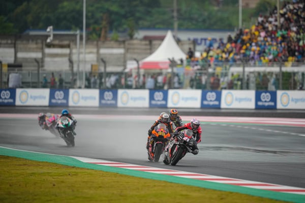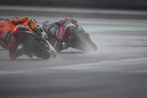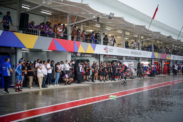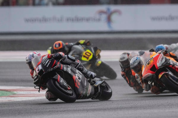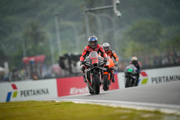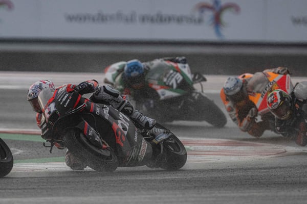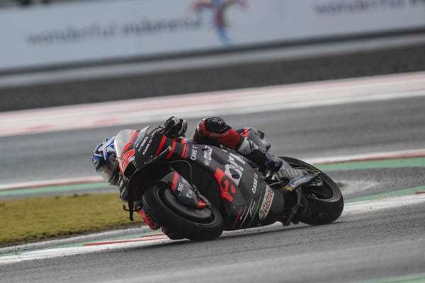 Pertamima Mandalika Circuit, Indonesia, 20 marzo 2022 - Un temporale tropicale a mezz’ora dal via della prima gara MotoGP sul nuovo circuito indonesiano, ha sconvolto il programma della corsa, ridotta di sette giri. Aleix Espargaró che si era messo in luce tra i migliori in condizioni di asciutto ha però saputo reagire bene alle nuove condizioni. Partito non benissimo è rimasto coinvolto in una bagarre nel corso del primo giro perdendo molte posizioni ma da lì ha iniziato a girare forte e costante, in buona confidenza con la sua RS-GP.