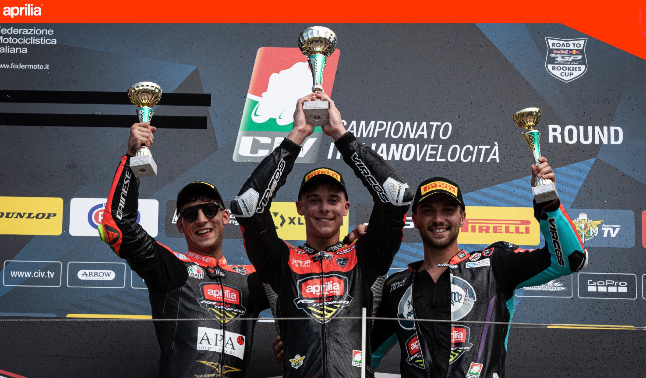 Podio Gara 1: 1° l’americano Maxwell Toth (attualmente leader del campionato, al centro della foto), 2° Francesco Mongiardo (sx), 3° Lorenzo Sommariva (dx).
