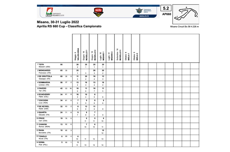 La seconda e ultima gara di domenica ha poi concluso il fine settimana del Trofeo Aprilia RS660, anche in questo caso, con dieci giri per nulla scontati. Partenza dalla pole position conservata ottimamente anche in questo caso per un Francesco Mongiardo più determinato che mai, bravo a proteggere le prime staccate. Stesso discorso di Gara 1 per Max Toth, partito ancora una volta non al meglio ma anch’esso ottimo a recuperare in fretta posizioni, arrivando al sorpasso su Mongiardo per la prima posizione. Purtroppo per l’americano, un problema tecnico ha fatto in modo di mettere fine anzitempo alla sua gara, escludendolo dalla lotta per il successo.