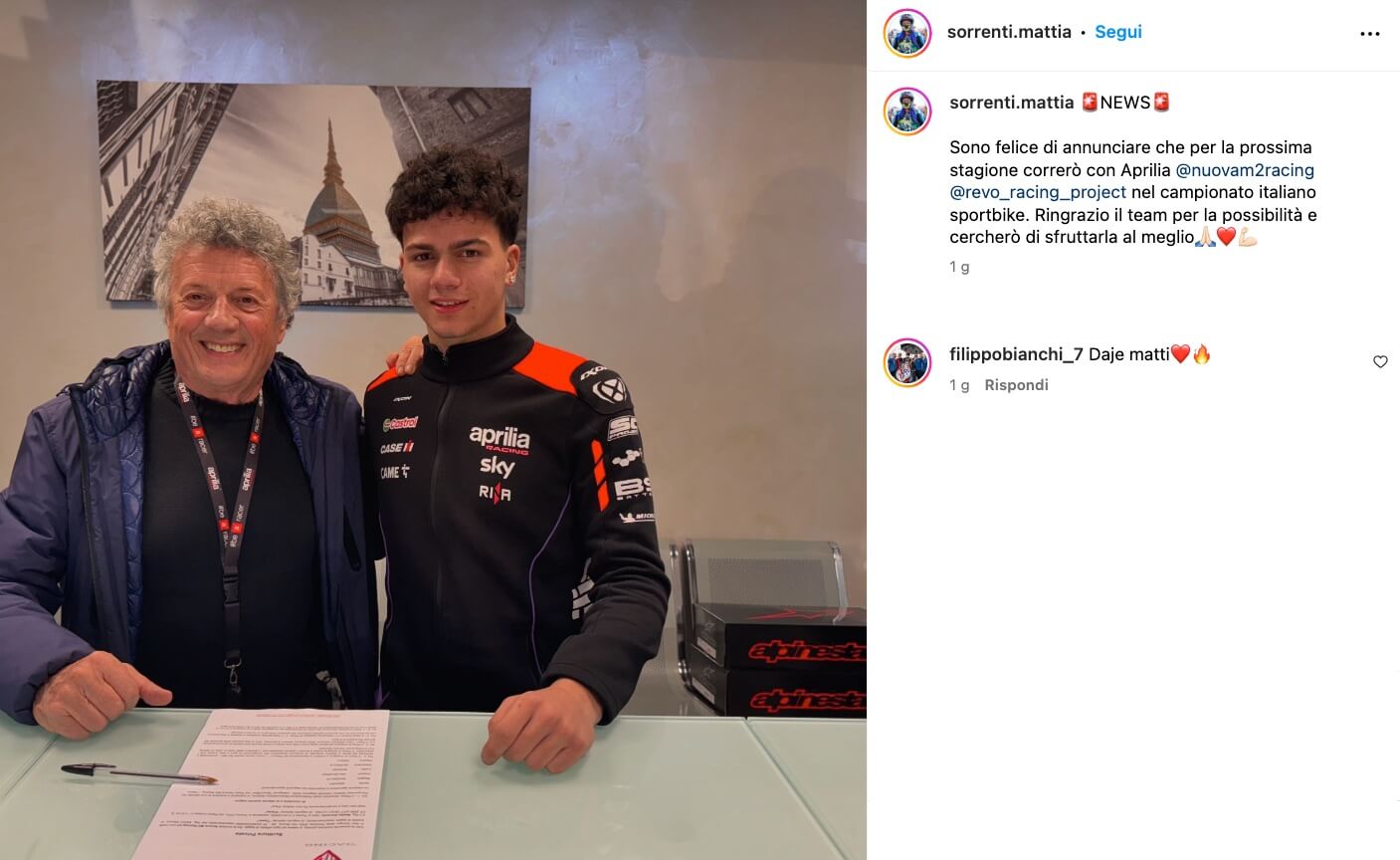 Enzo Chiapello e Michele Bonaldo, team owners di Revo/M2 Racing, hanno dichiarato: “La nuova categoria Sportbike rappresenta una sfida importante per il nostro team e siamo felici di iniziare questo percorso con un talento come Mattia Sorrenti. Crediamo fortemente nelle sue capacità e siamo sicuri che saprà regalarci grandi soddisfazioni. Con l’Aprilia RS 660, continueremo a mantenere viva la nostra tradizione di eccellenza e passione”.